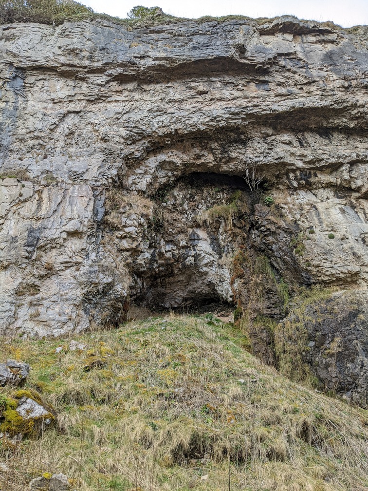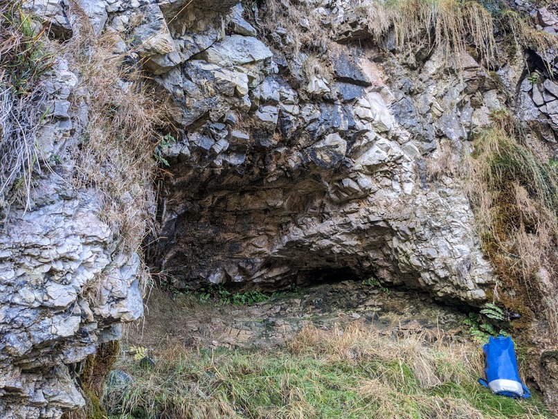 A 4 m wide, 5 m high opening with a small waterfall flowing from a slot at the top. reduces about 1 m in to a 2.5 m wide, 1.2 m high slot at the top of talus slope.