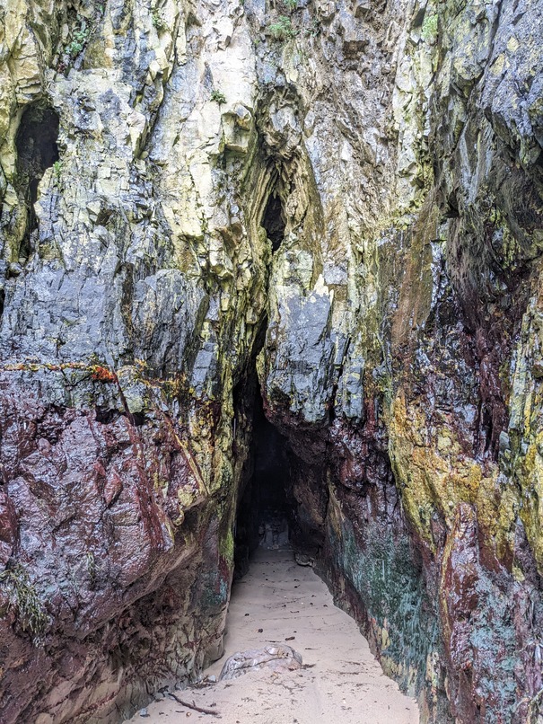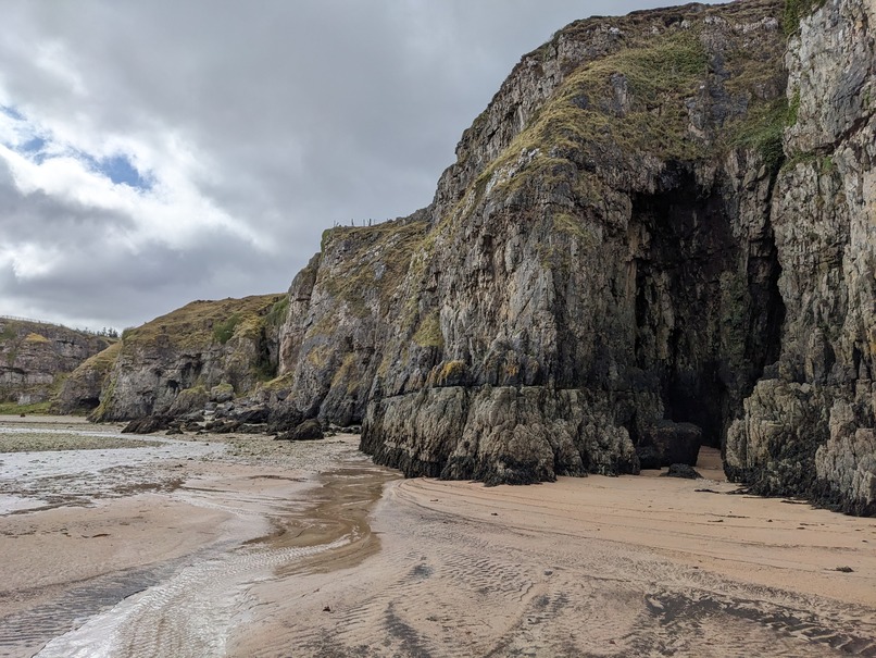 Tidal sea cave at the head of a diagonal side-geo midway along the western side of the Geodha Smoo. Tufa deposits are visible in the highest parts of the cave, and a freshwater spring within the intertidal part of the cliff is present nearby.