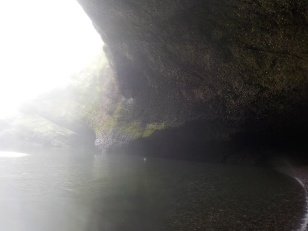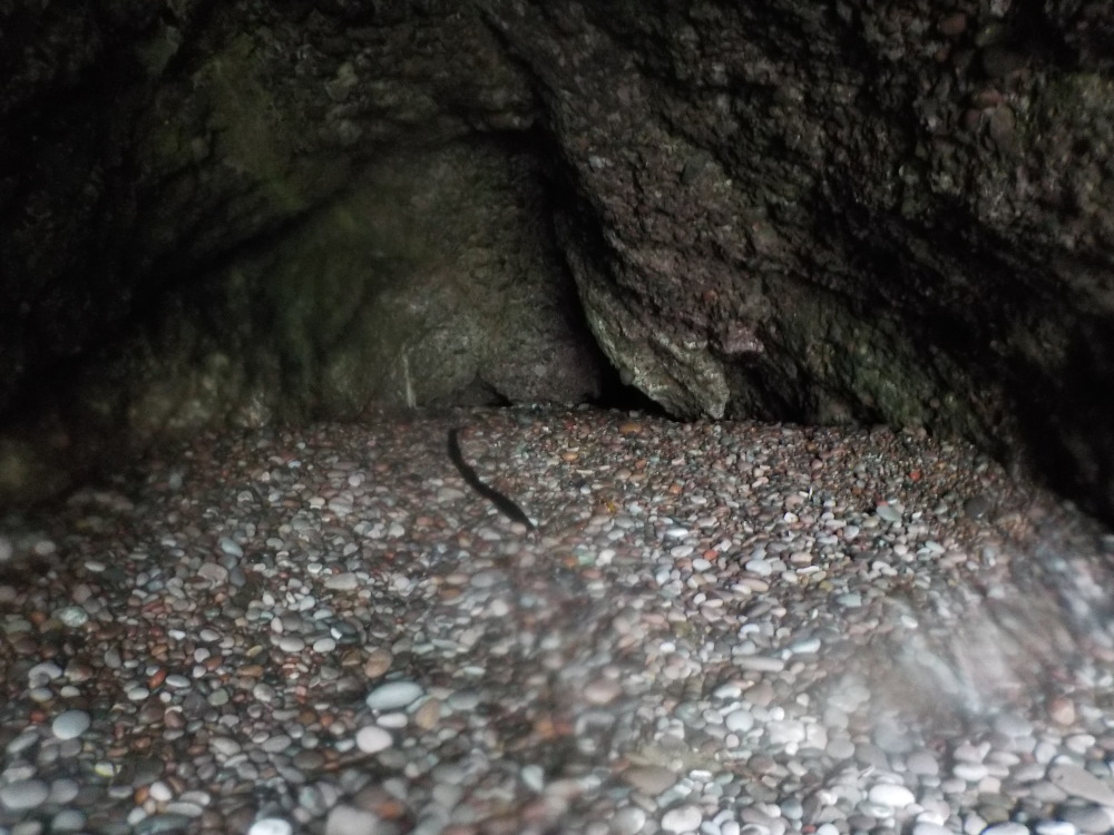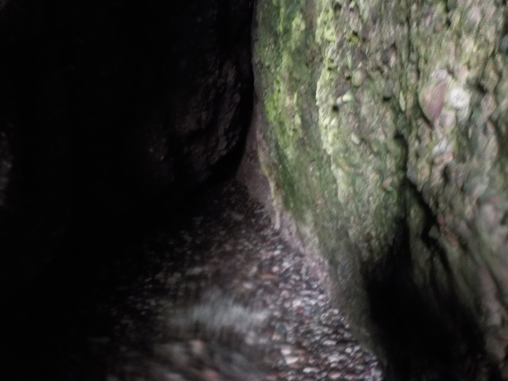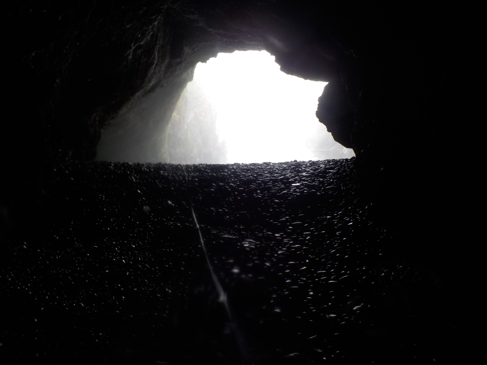 This seacave is a wide cavern across the whole 35m width of the 135m long geo which leads to it. It has a fairly steep pebble beach and there are two much narrower extension tunnels at the back, which look as if they might go further if the pebbles were removed. The larger (N) extension tunnel has a triangular c/s with dH = 7.5m and W = 8m. The smaller (S) is also triangular in c/s with dH = 3.4m and W = 6m.