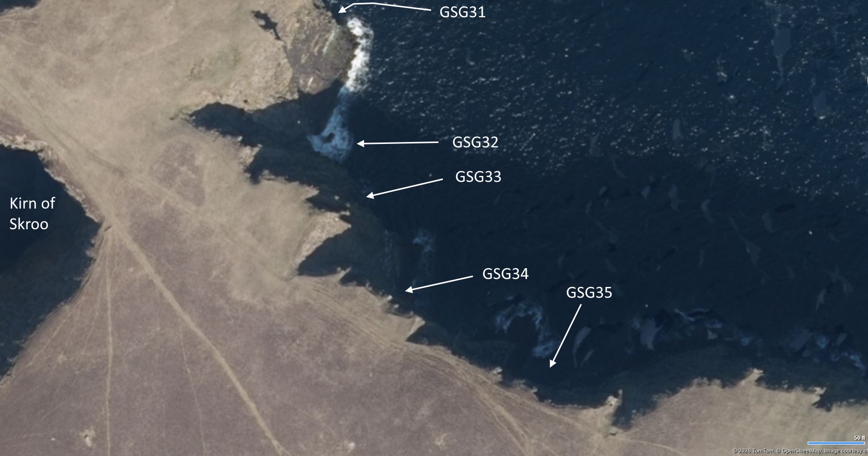 A sea cave facing roughly east, in the cliffs immediately to the east of the Kirn of Skroo.