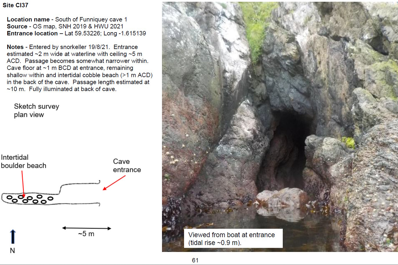 'Entered by snorkeller 19/8/21. Entrance estimated ~2 m wide at waterline with ceiling ~5 m ACD. Passage becomes somewhat narrower within. Cave floor at ~1 m BCD at entrance, remaining shallow within and intertidal cobble beach (>1 m ACD) in the back of the cave. Passage length estimated at ~10 m. Fully illuminated at back of cave.' [Report 1145]