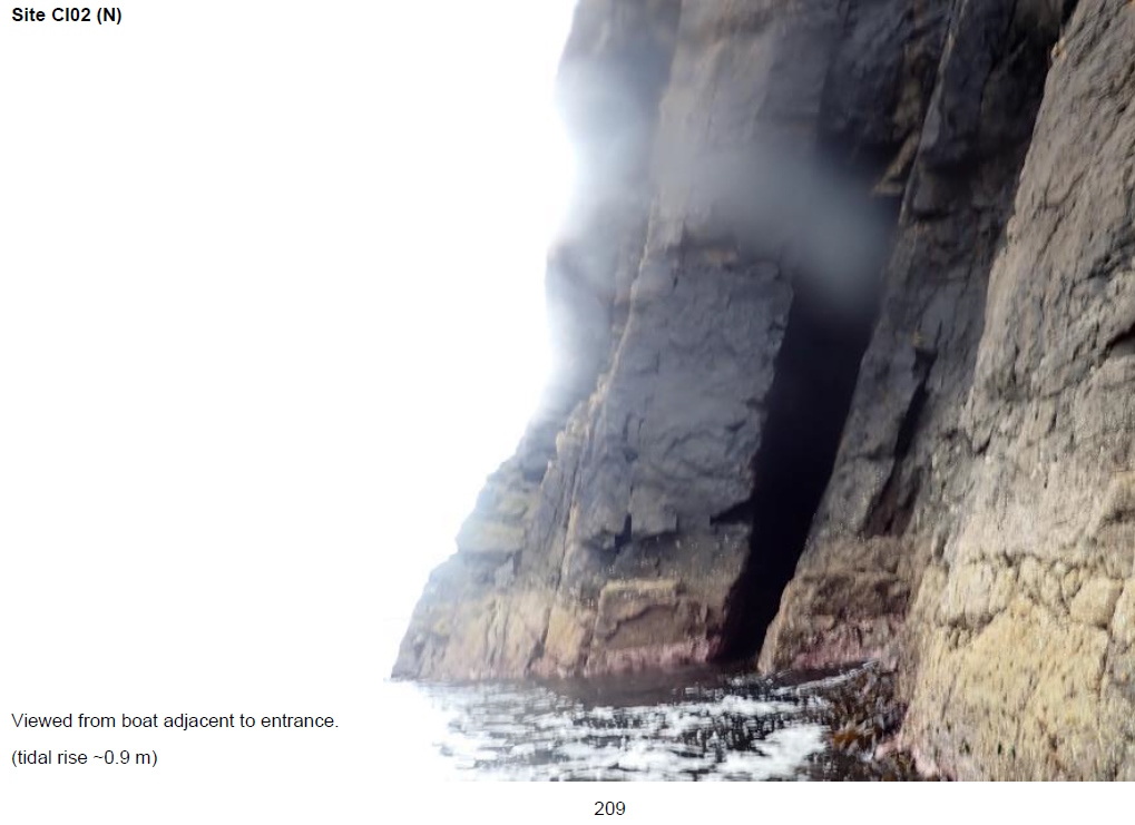 CI02 (S) - Viewed from boat 18/8/21. Distinctive low arched entrance in base of cliffs. Entrance estimated at ~4 m wide with ceiling ~2 m ACD. Immediately within the entrance is a rift-like chamber aligned roughly north-south and estimated ~12 m in length and ~4 m in width. In the chamber wall roughly opposite the entrance there is an opening into the narrow rift passage leading to CI02 (N). Water depth at entrance ~5 m BCD. Partially illuminated. [Report 1145 p211]