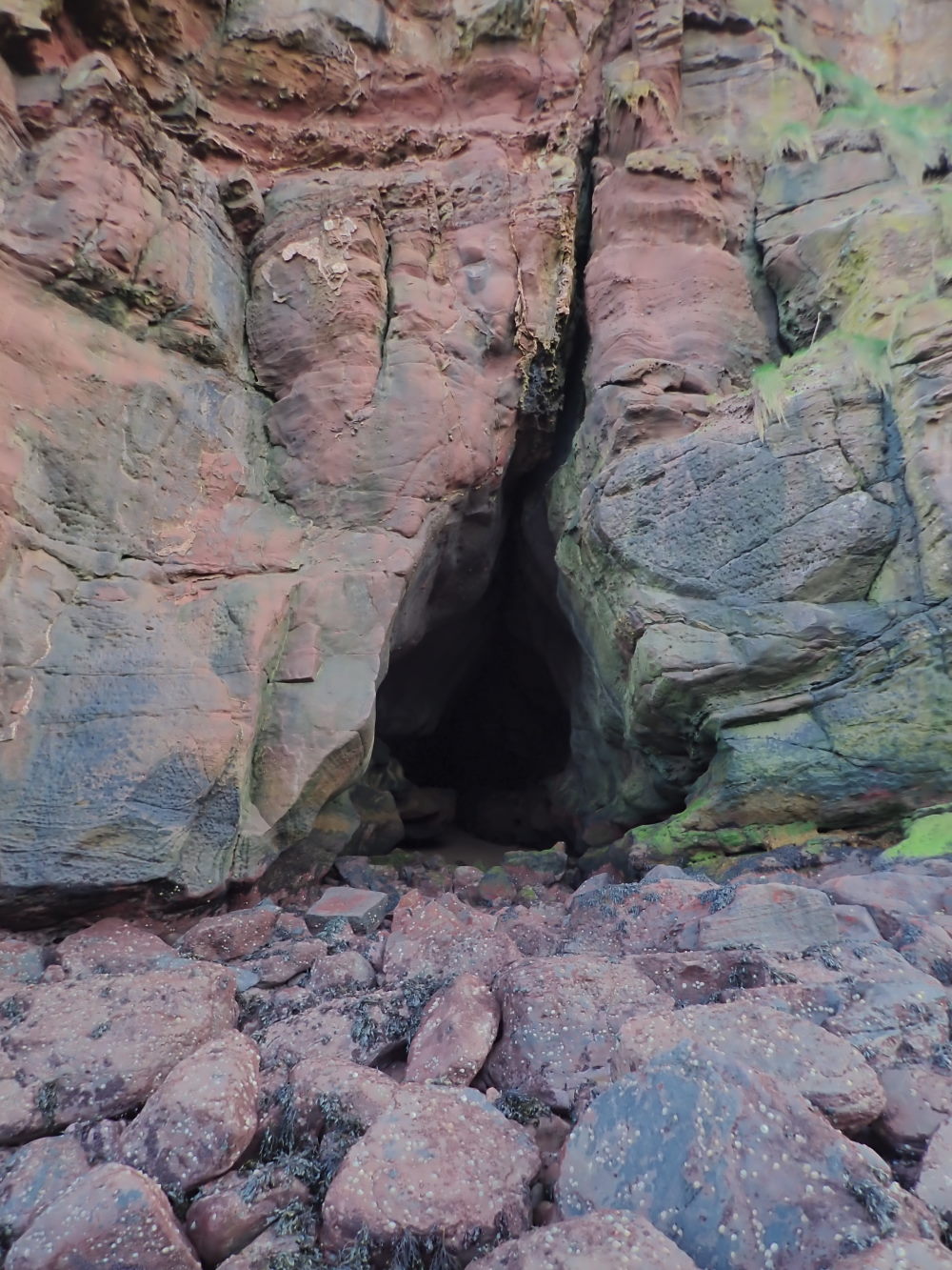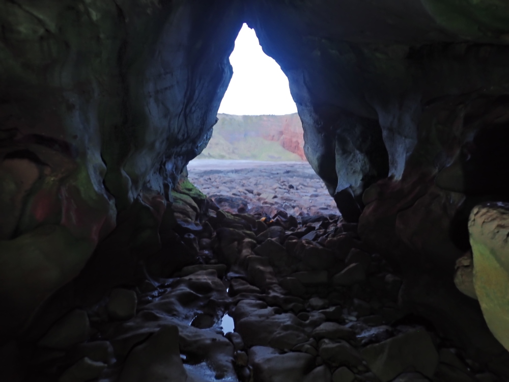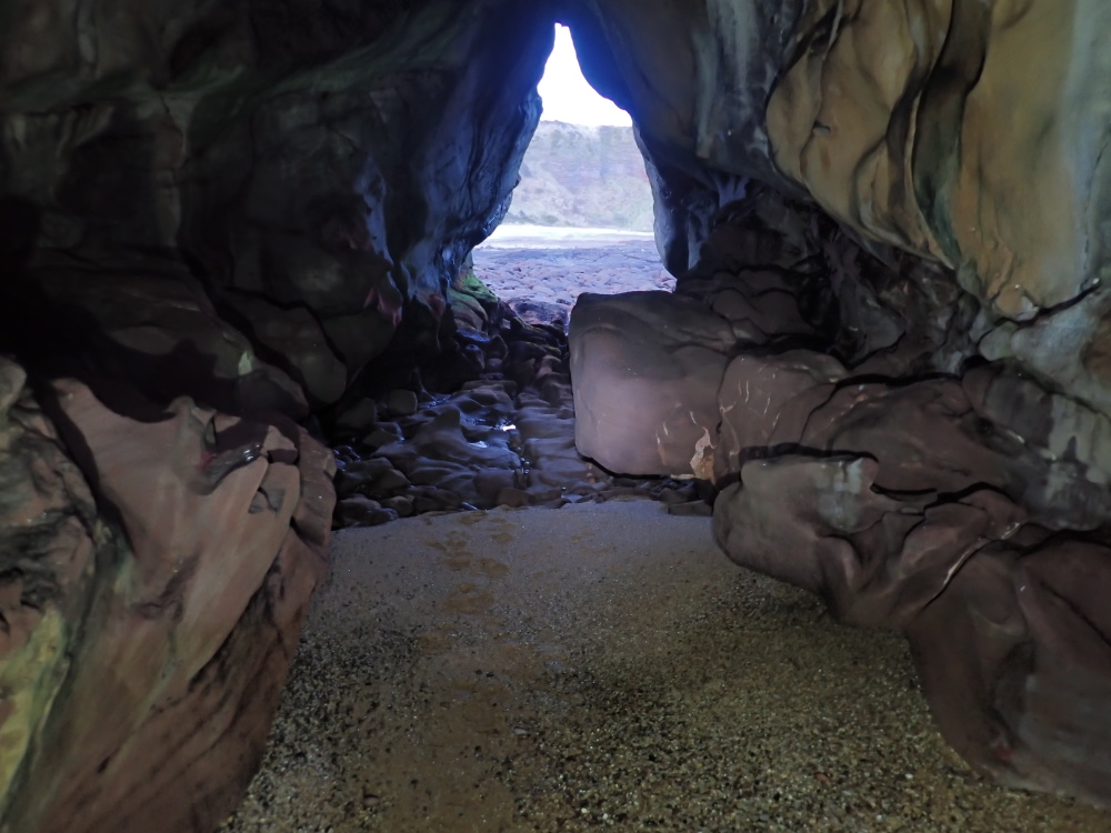 A mid intertidal, near vertical rift, sea cave at the base of the cliffs below Lud Castle facing 342 (NNW) across Castlesea Bay. It has a triangular entrance, which is 5.3 m wide at the bottom. The wave-cut platform continues about 10 m into the cave, after which there is a somewhat course sand beach. The walls are quite deeply and tortuously sculpted. It decreases gradually to a point at the end going straight until 35 m and then about 7 deg right.