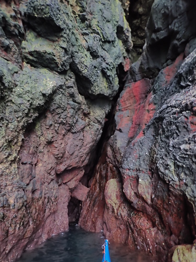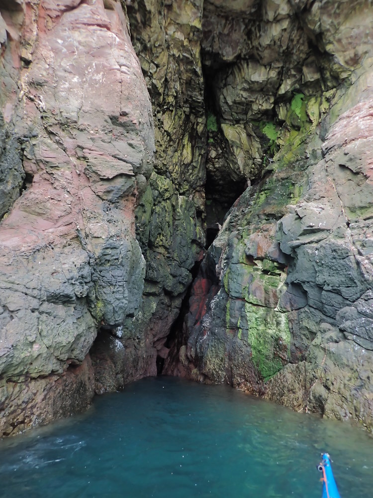 A fully intertidal cave with a rounded dumbell entrance shape. It is 3.7 m wide at sea level. Inside it runs about 20 m navigably, which then continues as a narrow intertidal rift sloping R (E). Near the ceiling, the L side of the rift goes vertical leaving an apex down triangular c/s tunnel of uncertain extent. Faces S by E.