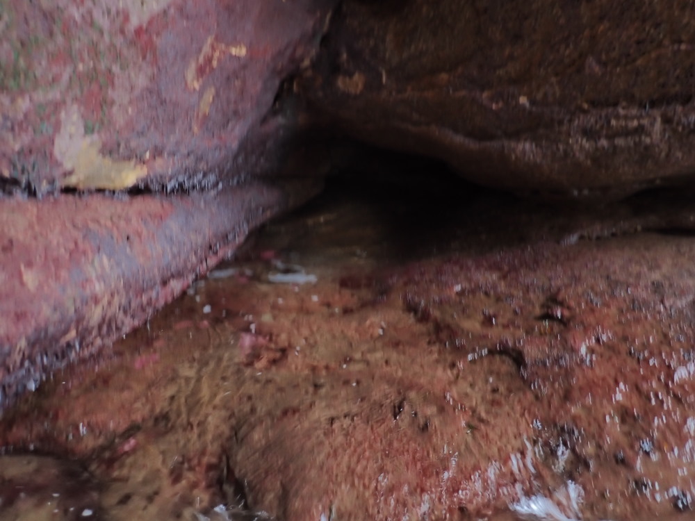 A large, shallow funnel under the cliff overhang leads to a quite small, triangular entrance into a full range intertidal low ceilinged cavern. It is approximately a long ellipse in plan, leading at the east end to an even lower entrance which penetrates the west wall of the wide geo immediately to the east. This entrance is at NJ 16526 70349. It is nearly submerged at a springs high tide. The cavern extends another 8m to the west. The cave floor is sand, with occasional large, angular boulders. These appear have fallen from the ceiling - which is corrugated with sharp angles. The inner cave empties completely at low tide except at neaps.
