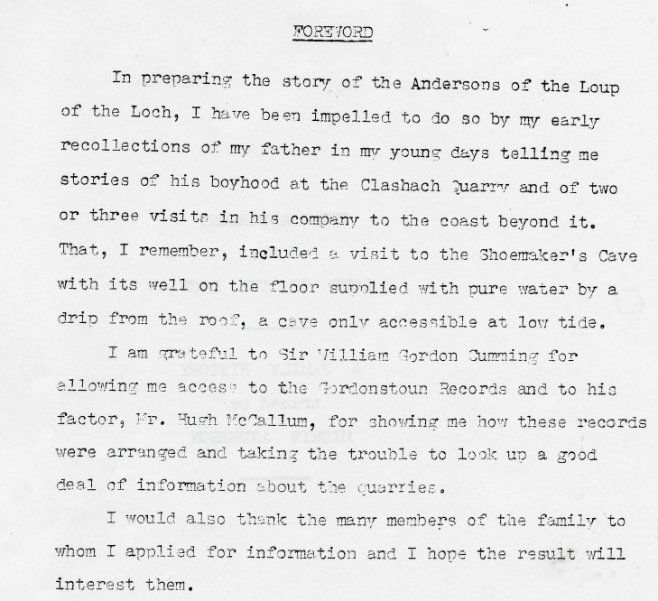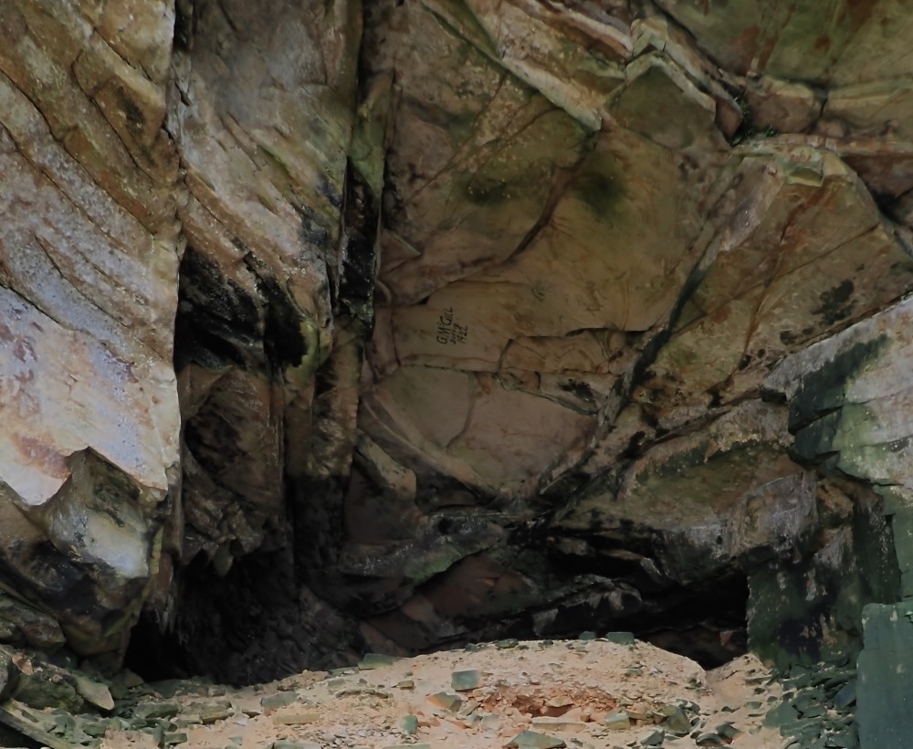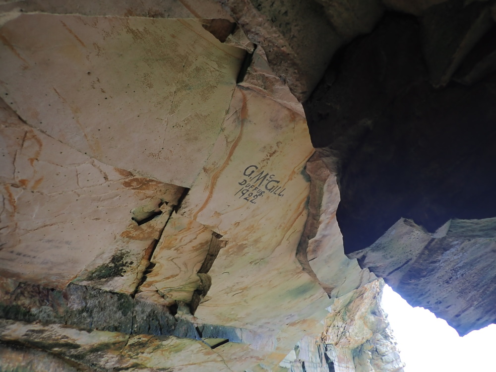It was named until 4/2/24 for G. McGill of Duffus (nearby village) who painted his name on the ceiling in 1922. However, a document entitled 'The Andersons of the Loup of the Loch' - a family history by Michie Anderson was uncovered by Dave Longstaff. In the foreword, it mentions a childhood visit to Shoemaker's cave which had a 'well' on the floor supplied by a drip from the roof. No indication of the precise location. But Constance Gordon-Cumming mentions a small cave overlooking Tailor's Castle and well raised up, 'in the centre of which a rudely squared stone receives the water which slowly filters through the sandstone roof.' Taken together we have a name and a location which matches this cave.
