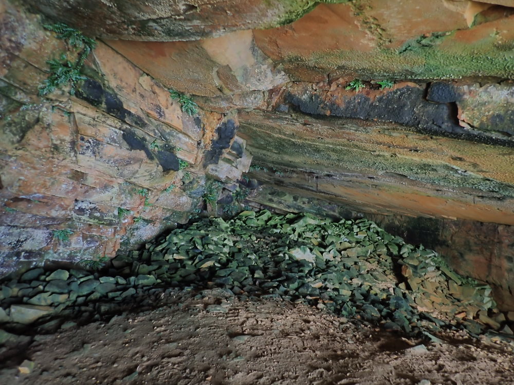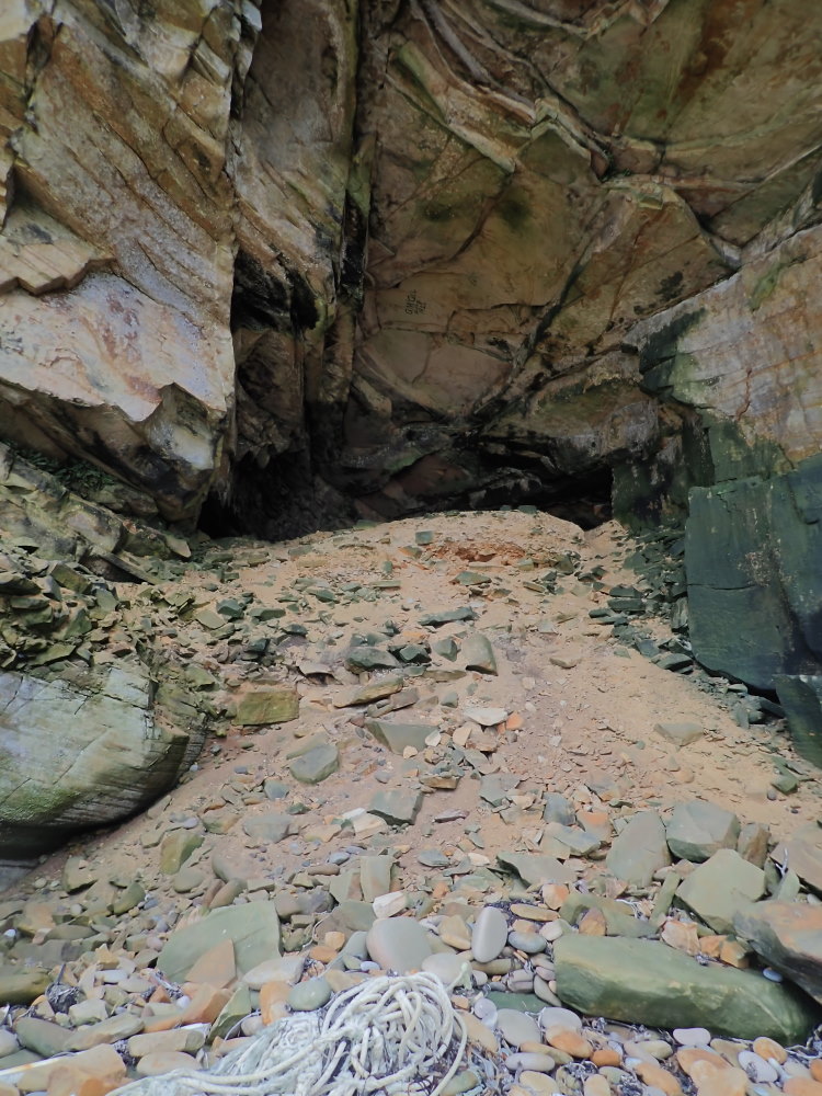 A supratidal cave facing NW. It has a steep talus pile of fallen rock fragments and loose sand and occasional limpet shells. Up above it slopes away somewhat to rock fragments without sand.