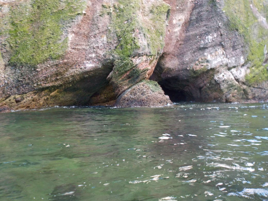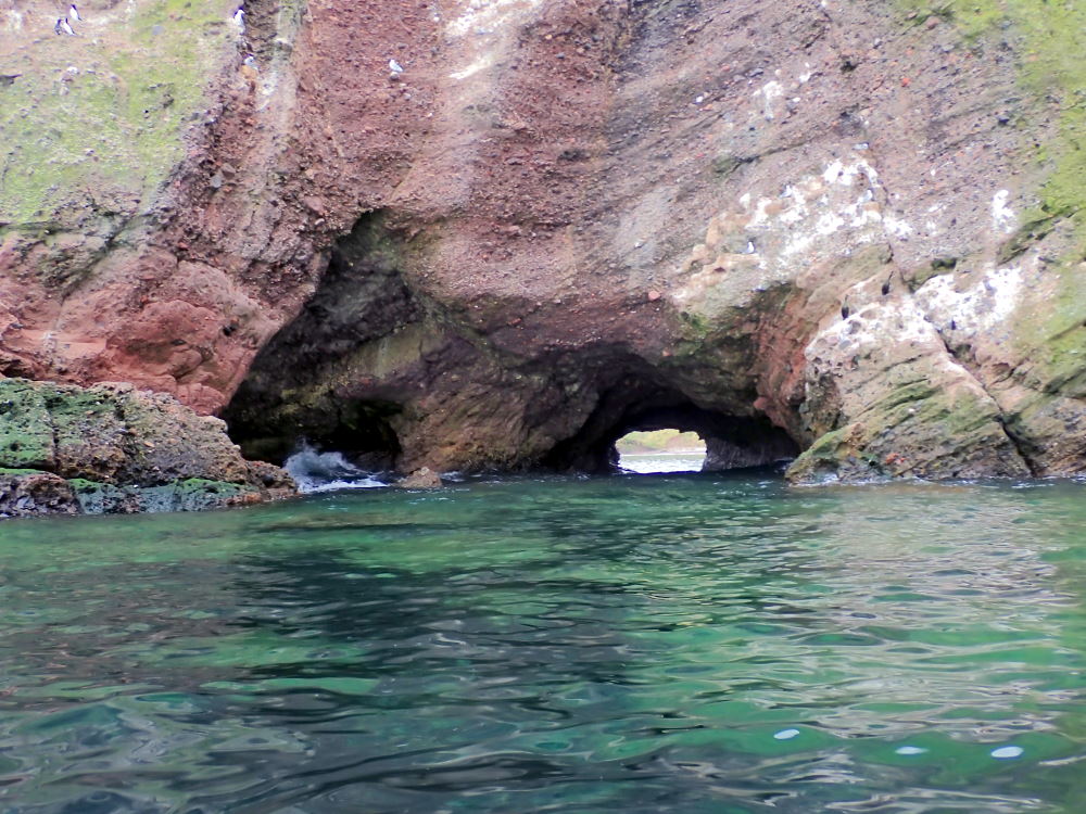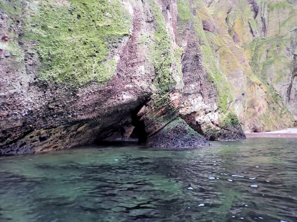 An intertidal cave system with 3 entrances - one small and round on the E side of Riddled Kaim. A wide SW entrance and and a mid W entrance are separated by a rock pillar on W side. Water inside only near high tide. It is navigable (11/10/19) through Riddled Kaim at HWS. There are a lot of rocks which make kayak passage tricky at mid tide.