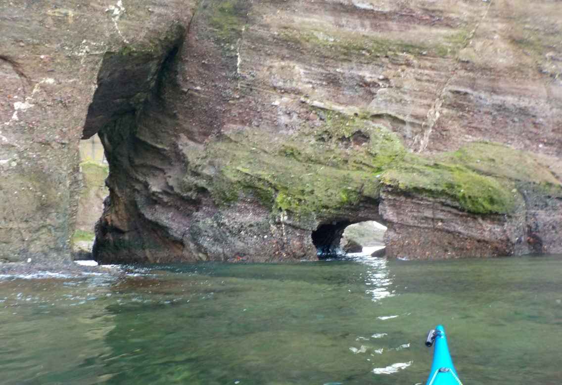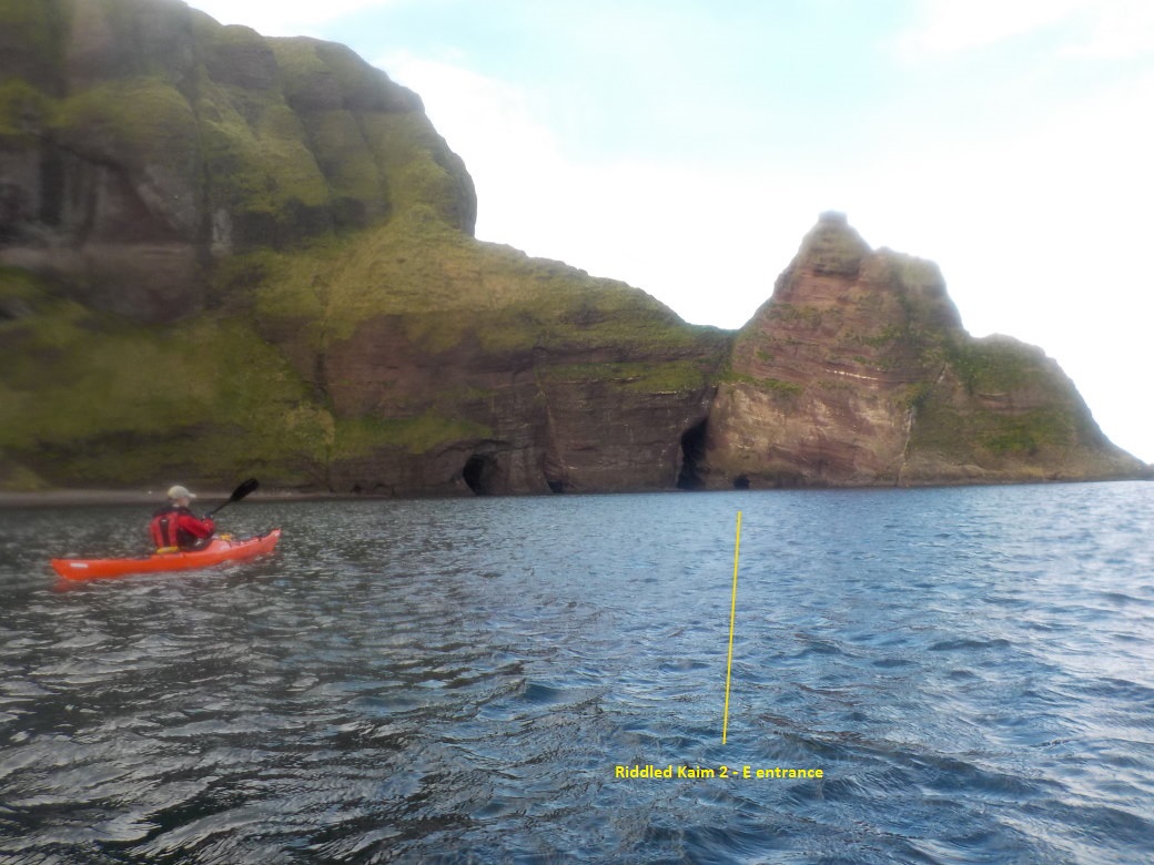 An intertidal cave system with 3 entrances - one small and round on the E side of Riddled Kaim. A wide SW entrance and and a mid W entrance are separated by a rock pillar on W side. Water inside only near high tide. It is navigable (11/10/19) through Riddled Kaim at HWS. There are a lot of rocks which make kayak passage tricky at mid tide.