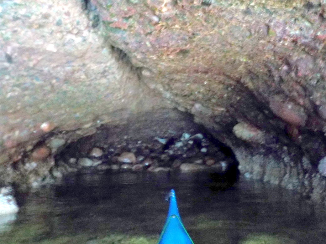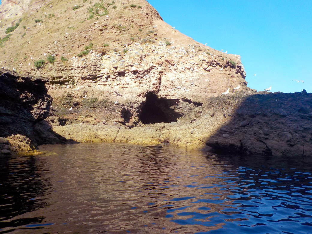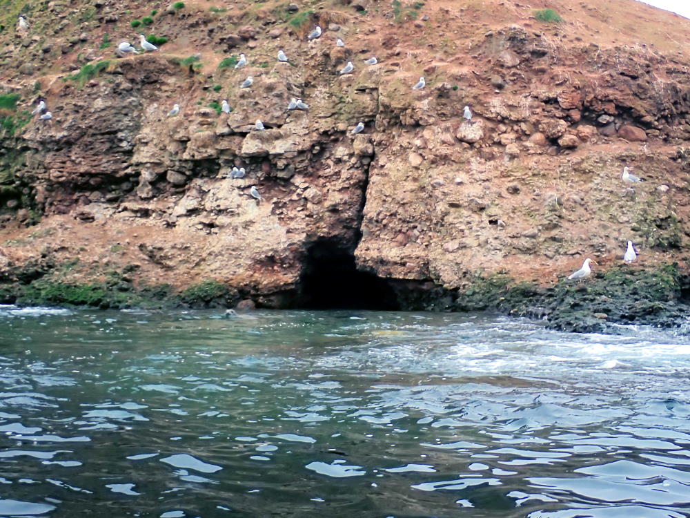 Small cave running NNE into S end of Seal Craig - a rock island just NE of Riddled Kaim. It has a ledge at the entrance just awash 2h 08 after a 3.52 tide. This probably leaves a pool inside. Saw approx six seals inside on 20/6/19.