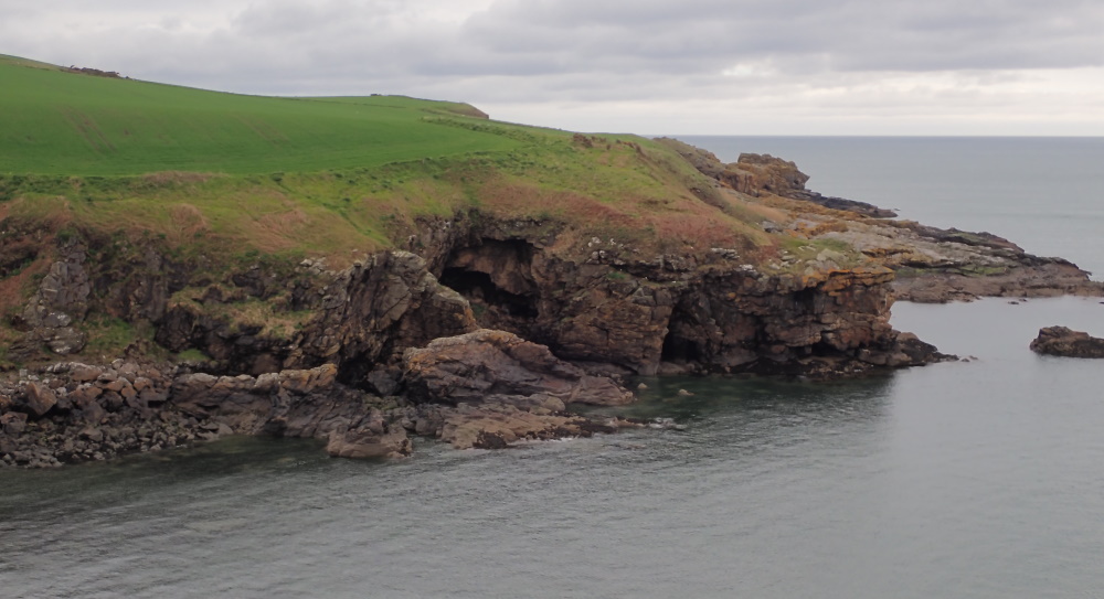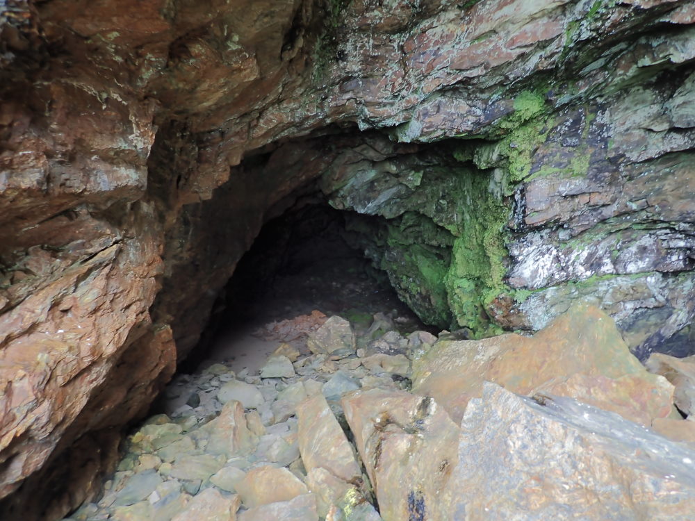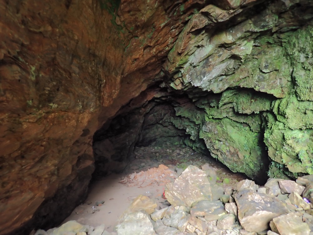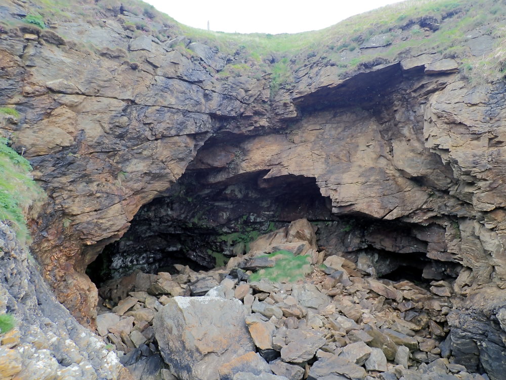 A supratidal cave system with the main tunnel recessed into the cliff and facing 190 (S by W). There is a big pile of big, sharp edged boulders around the entrance which appear to have fallen away from all the vertical and ceiling surfaces. The main entrance is 13 m wide.