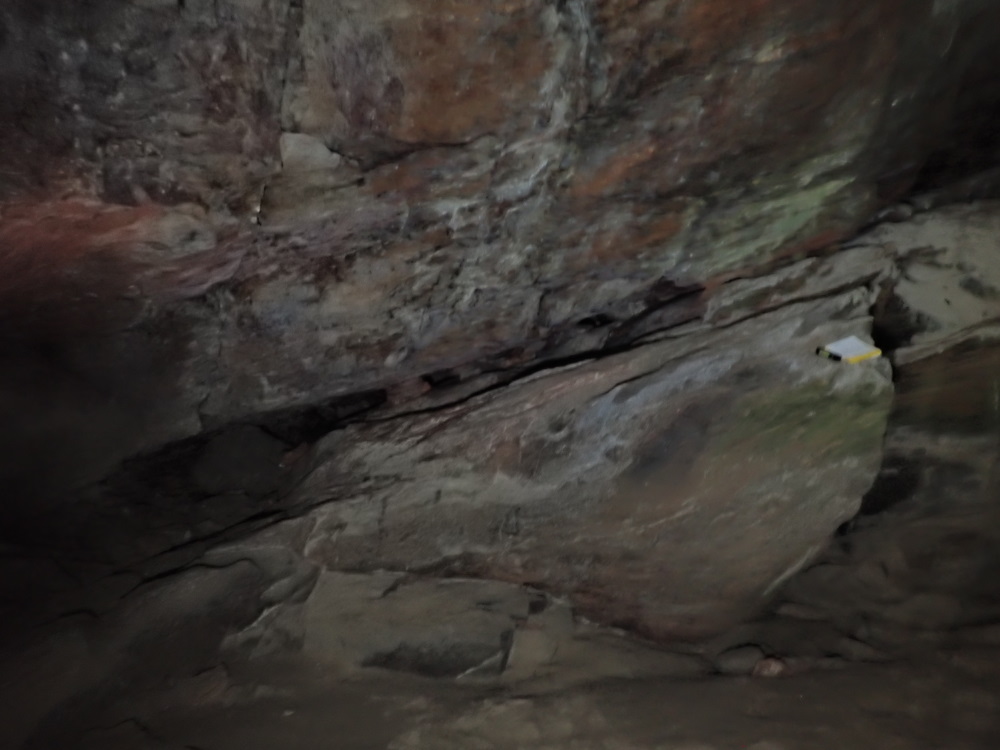 There is a small rift tunnel going roughly NNW on the W side, about half way along. The rift is at a shallow angle to horizontal, dipping to WSW. It extends 5.8 m by laser RF.