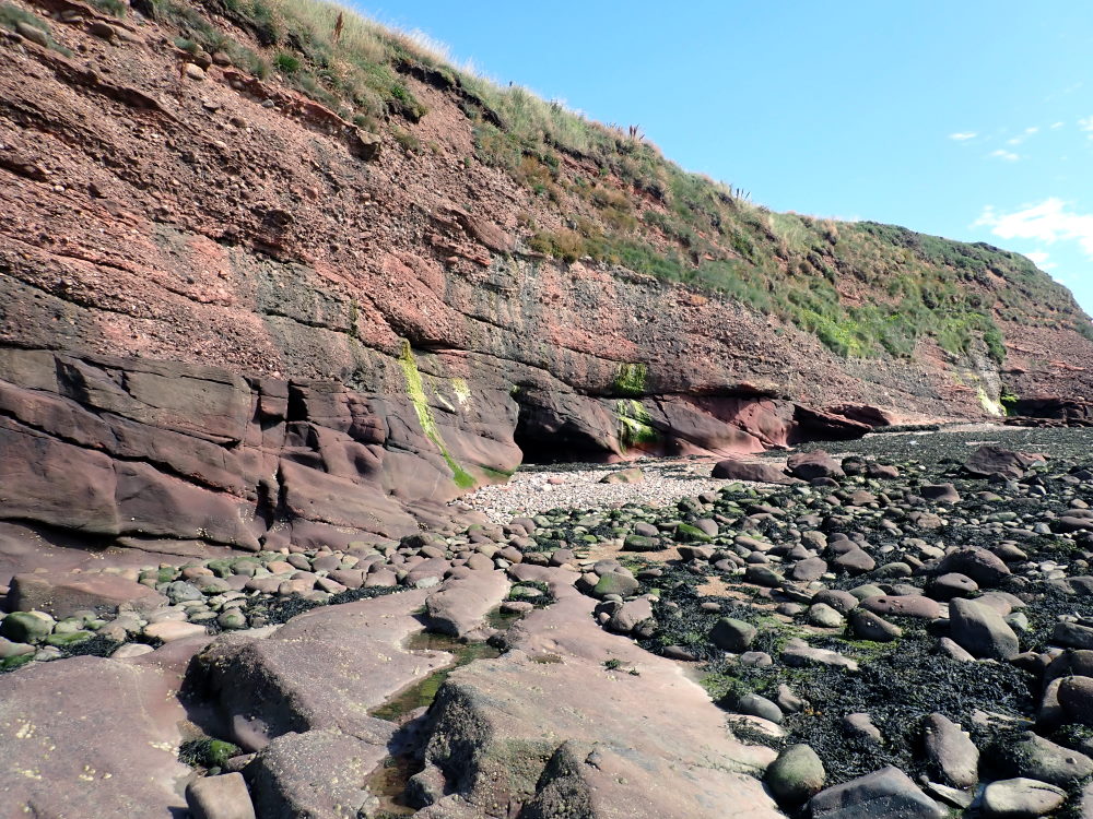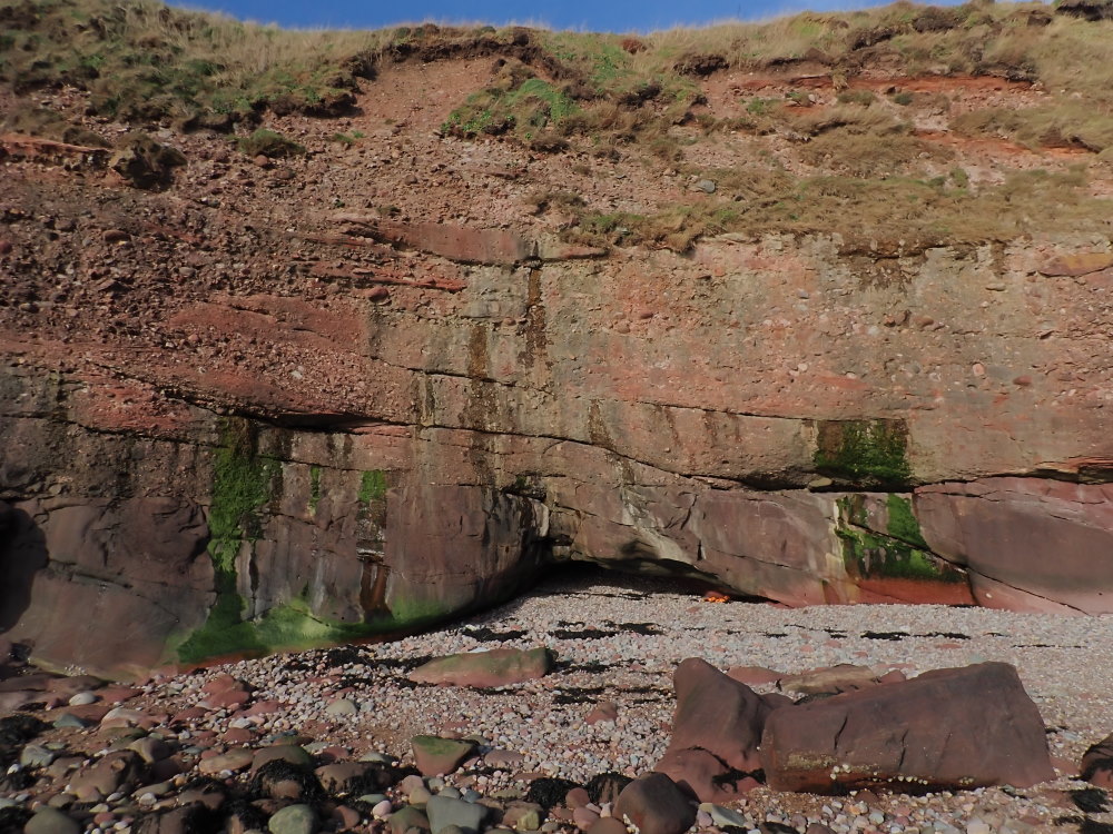 A small, upper intertidal cave at the base of the cliff. The entrance is 5.2 m wide at the bottom.