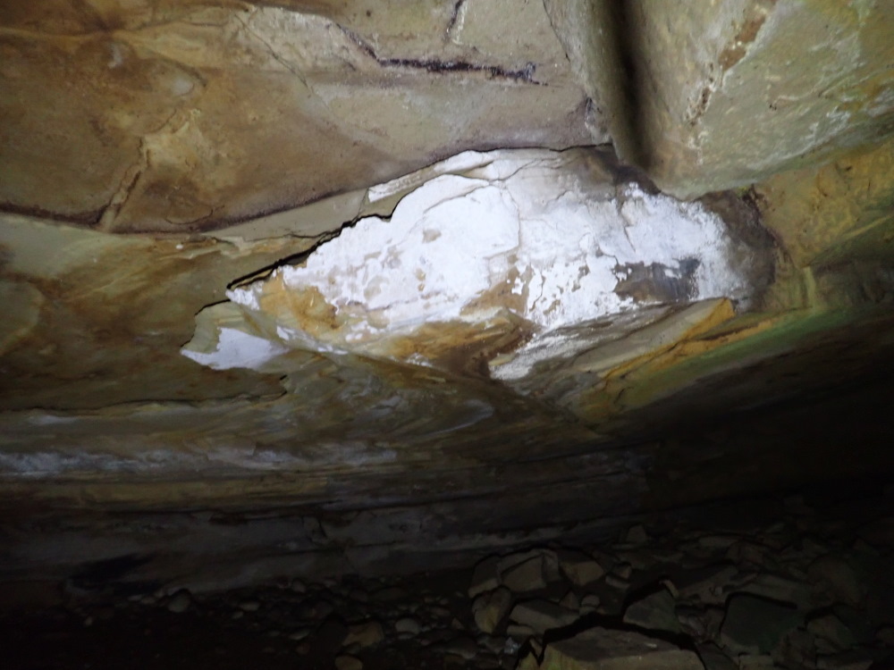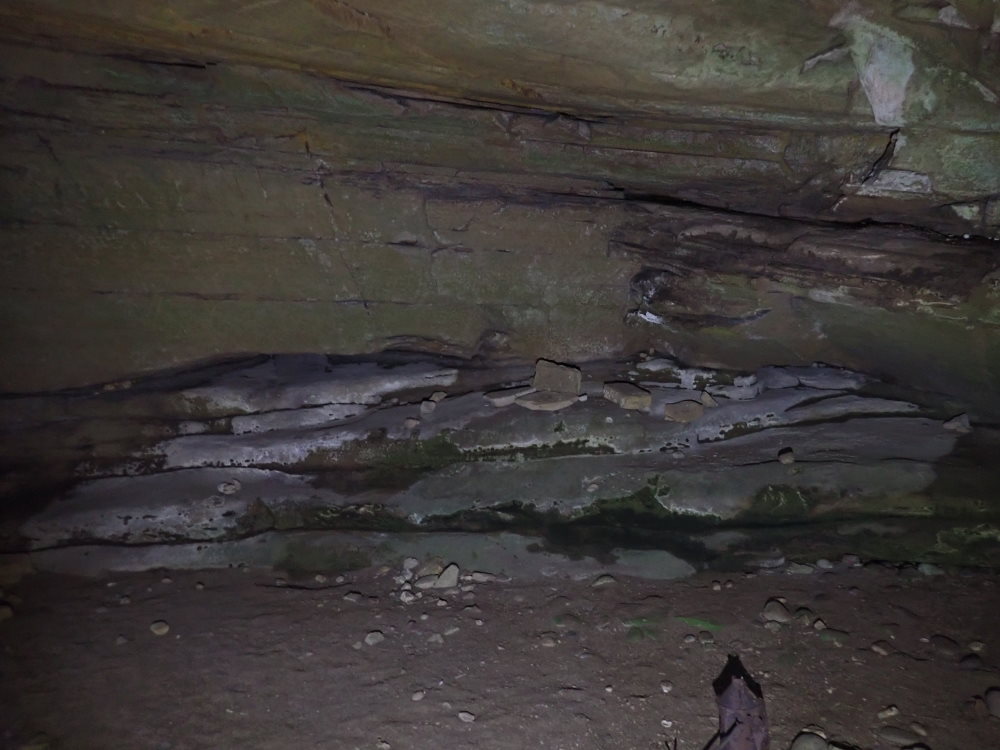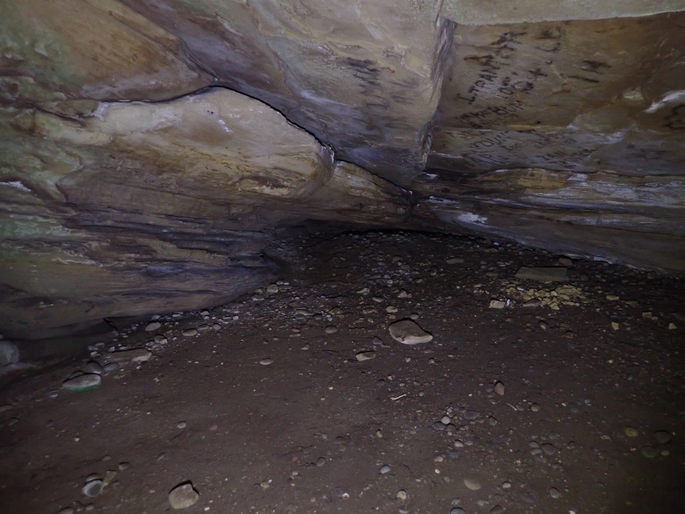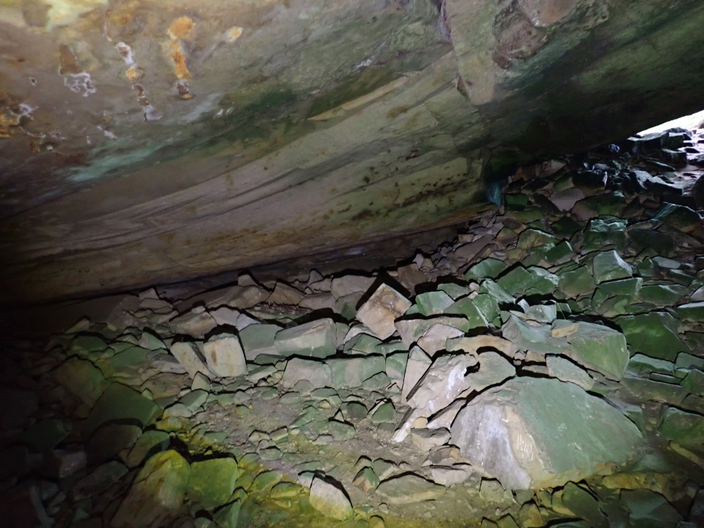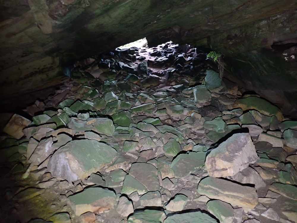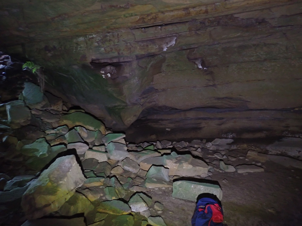 The 3 m wide x 1.1.m dH entrance is well hidden by the debris (talus) pile in front. It looked like another overhang from very nearby. You go down a rock debris pile to a flat sand floor and a roundish space 12m wide x 3 m dH with a lowering ceiling extension.