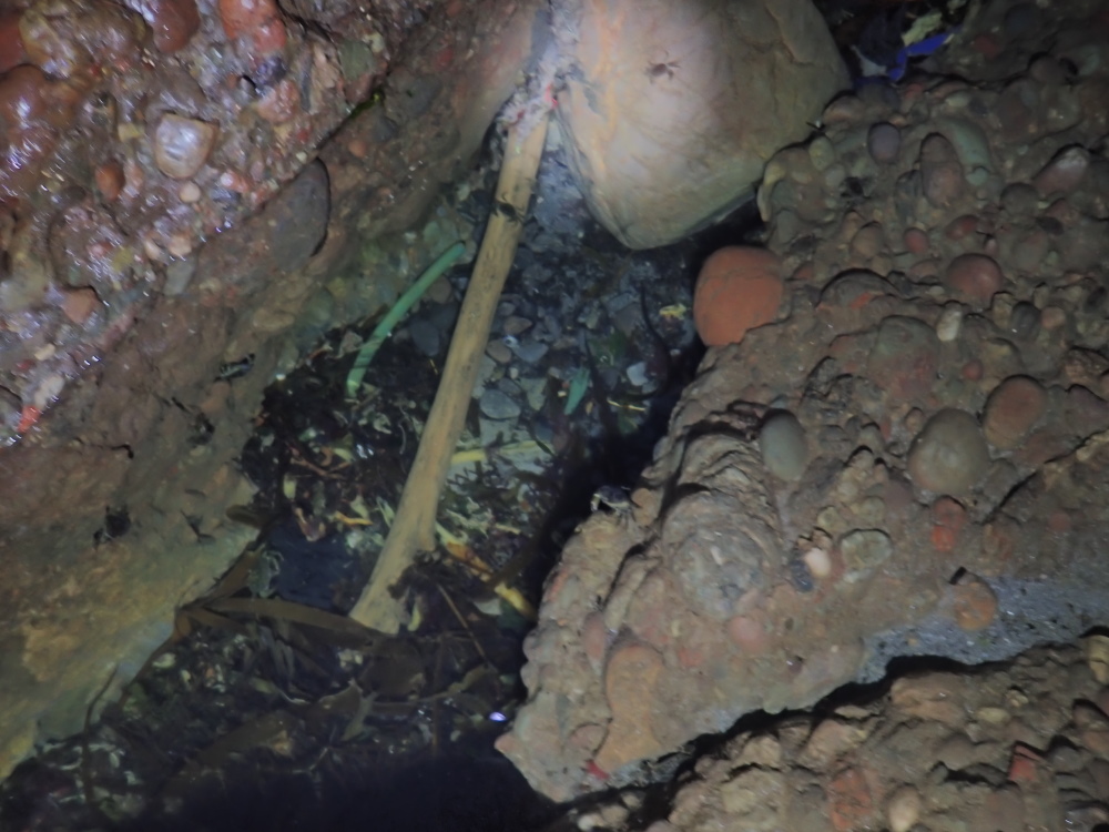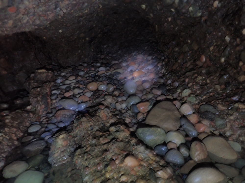 An intertidal cave on the left of the N end of Powie's Slough geo which runs 10.8 m 028 deg (NNE) before turning right to the end on 072 (ENE). The floor is mostly solid conglomerate which is deeply furrowed and with few loose stones. The entrance is 4.7 m wide.