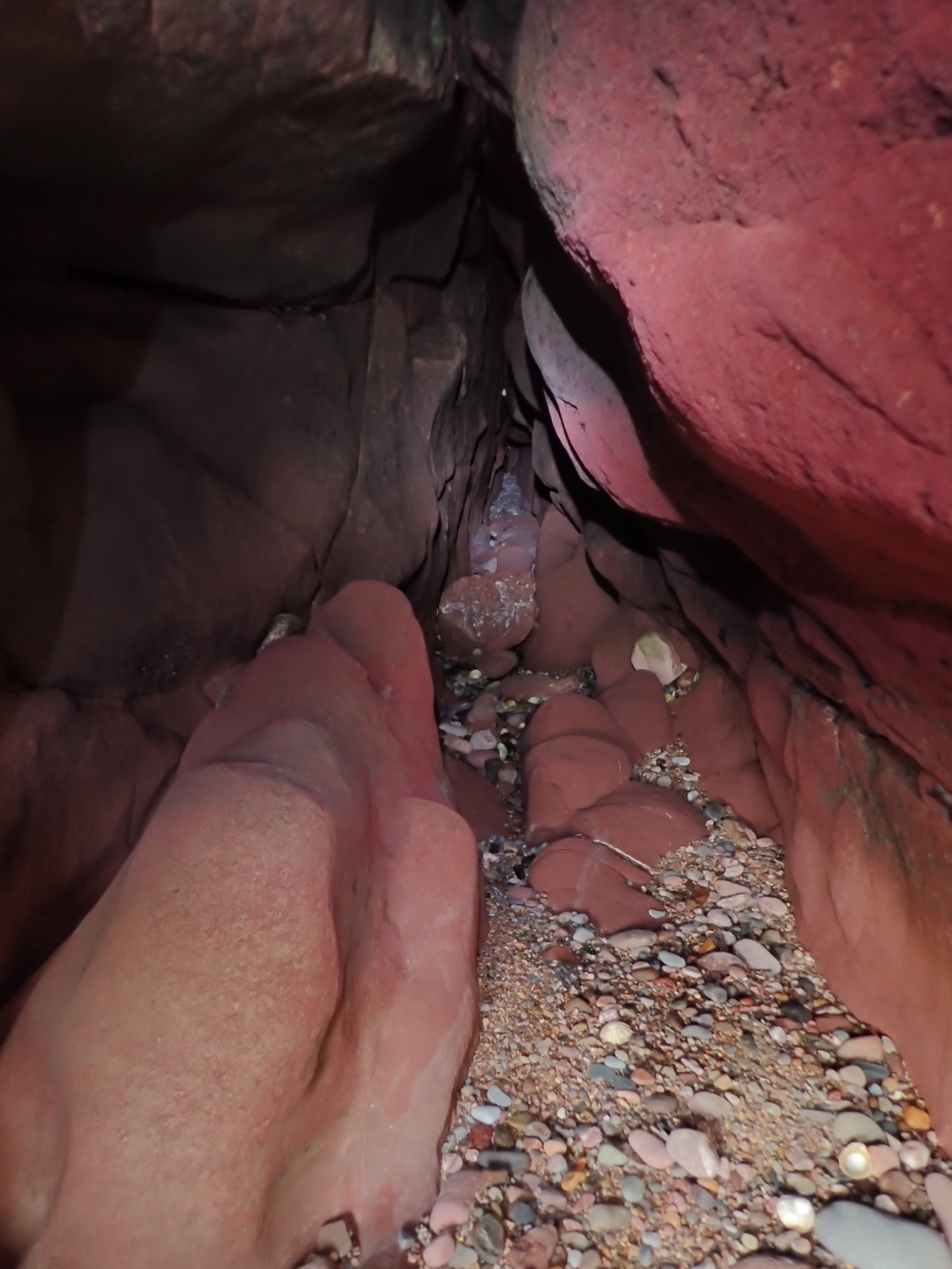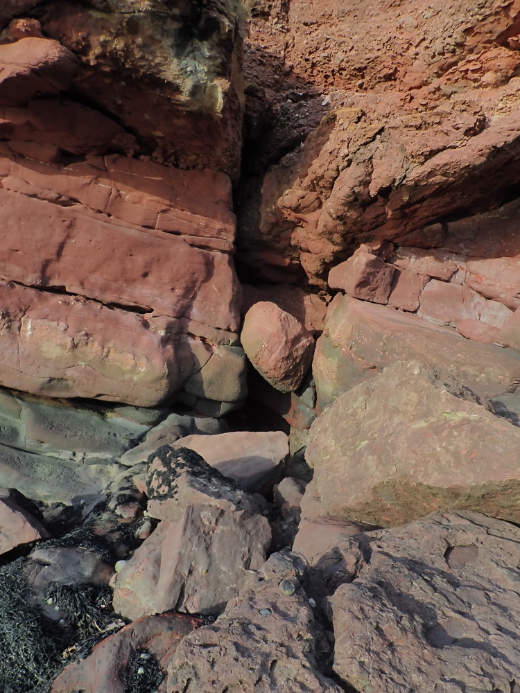 A small, narrow, upper intertidal rift cave facing 230. It has a large boulder jammed in the entrance which has a dH of 1.2 under it. Behind this boulder dH is 2.9 m. Width at entrance is 0.94 m