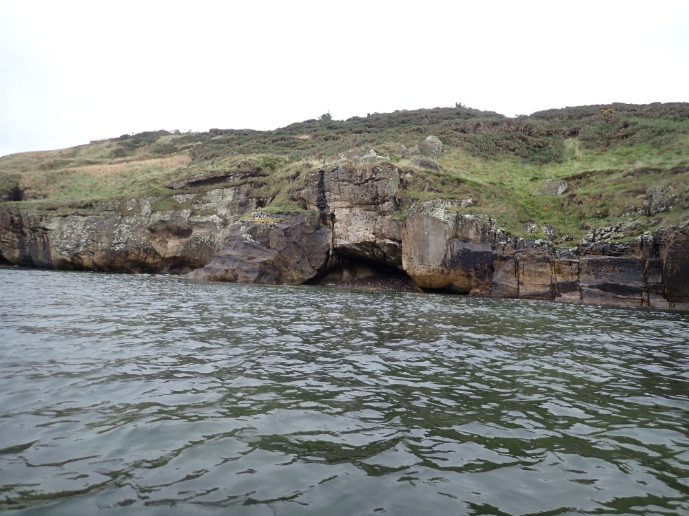 A small, upper intertidal seacave with a half round plan, facing N. It has a small apse on the slightly right of centre joint line. It is 8.0 m wide.
