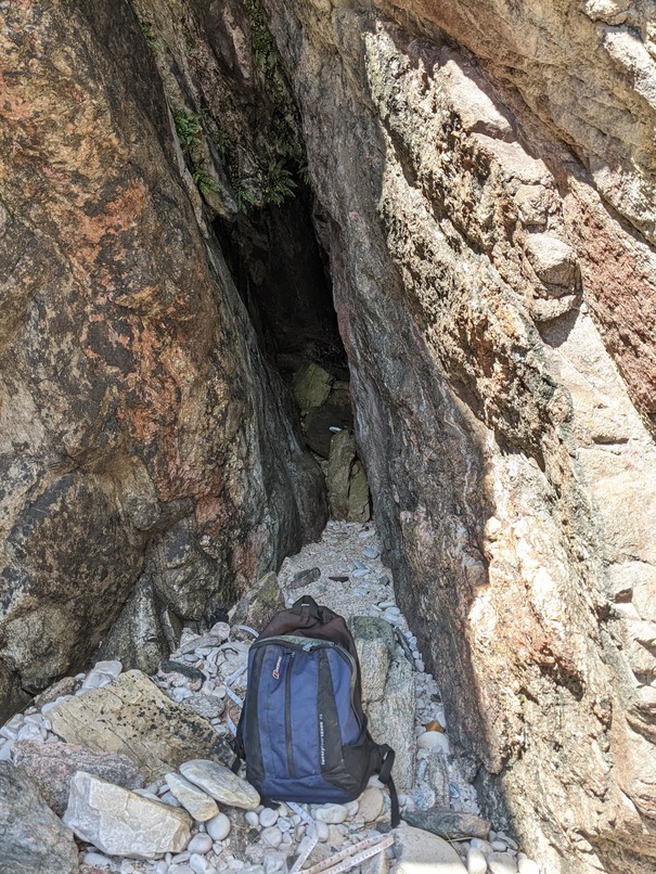 A short, inclined cave formed along a shear zone within Lewisian Gneiss at the western extremity of Geodha nam Bàirneach. The 0.7m-wide entrance is ~4m in height, but quickly closes down to a 1.8m-tall terminal wall after just 5m. Located close to a steep grassy access gully (that has formed along a major fault juxtaposing Cambrian quartzite with Lewisian Gneiss), and although the cave appears to be supratidal, the presence of flotsam within implies flooding during stormy conditions.
