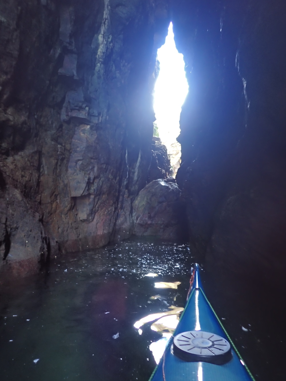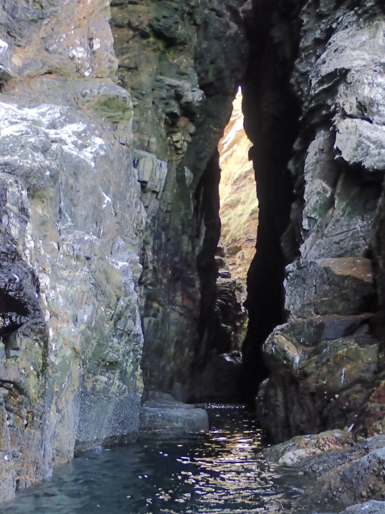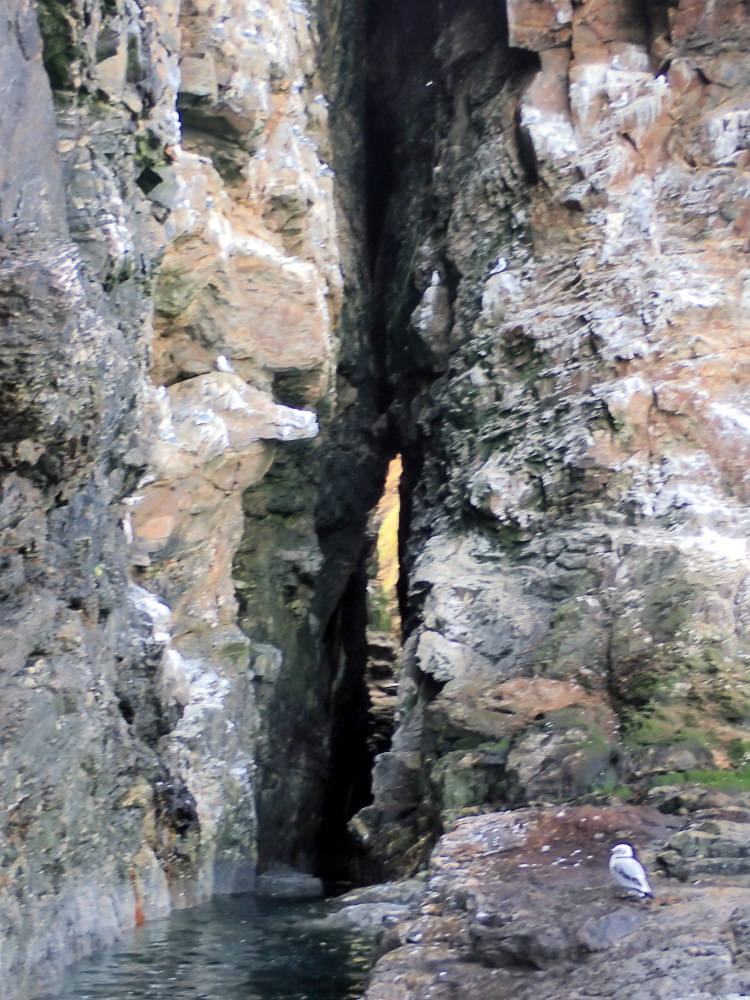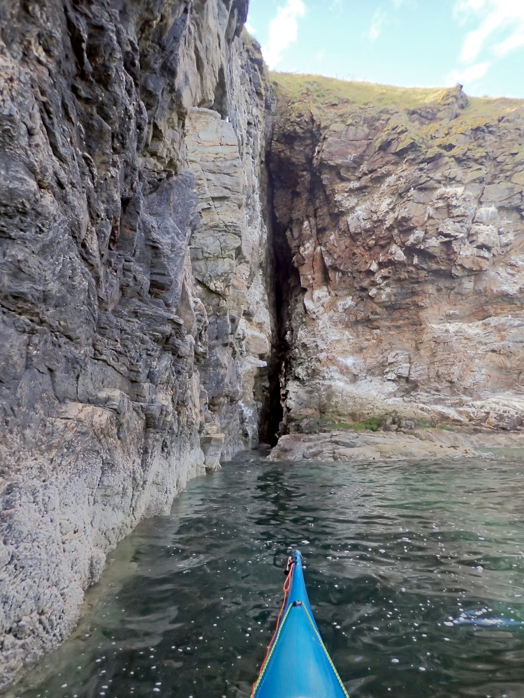 A tall rift cave which runs ca SSE through a headland on the S side of a geo which is at the N end of Murray Heugh and just to the SW of Green Slough. It is navigable in the top half of the tide and low swell from this seaward end up to a large boulder. It may be navigable end to end on a high spring tide.