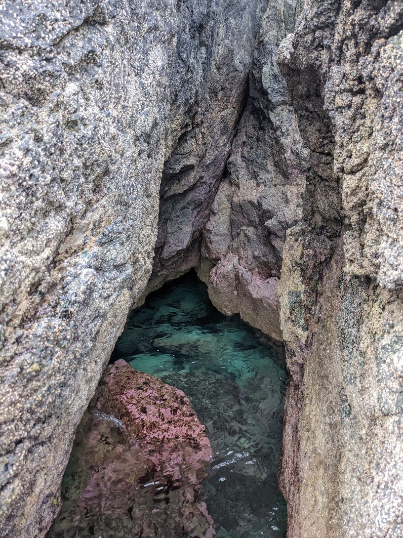 Subtidal cave of uncertain length at head of geo, observed during v.low tide.