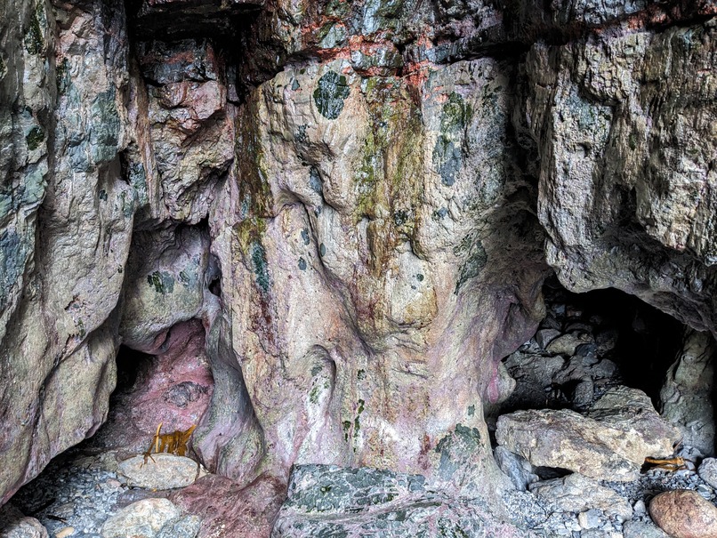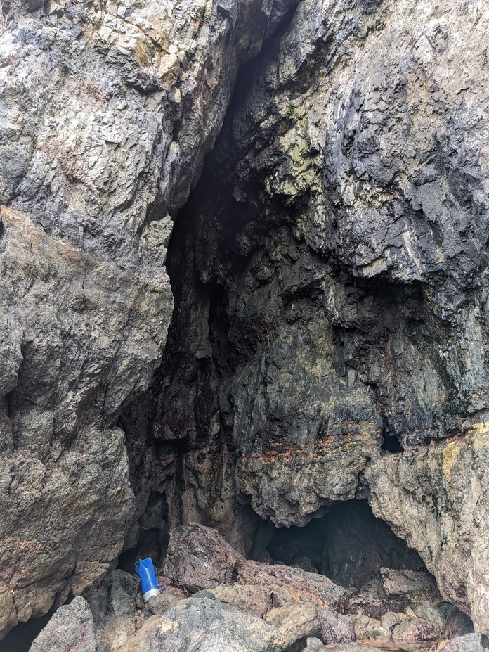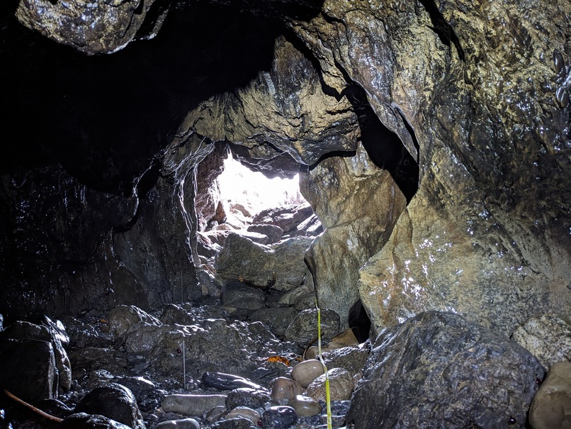 The relatively lofty entrance area splits into two parts; a crouch leading into a small chamber on the LHS, and a longer walking-size linear passage on the RHS.