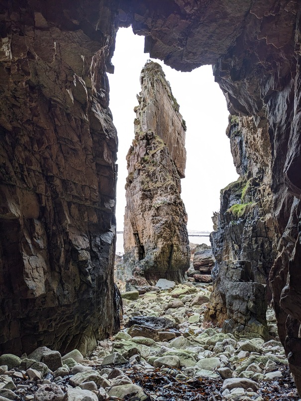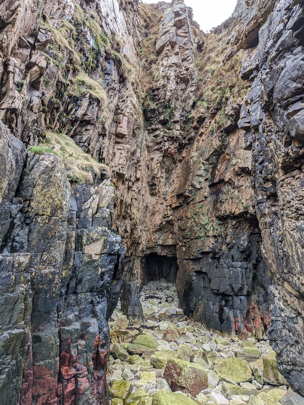 Toll an Dìona means 'protected hole' in Gaelic, referring to 'The Guard' (sea stack) at the mouth of the geo.