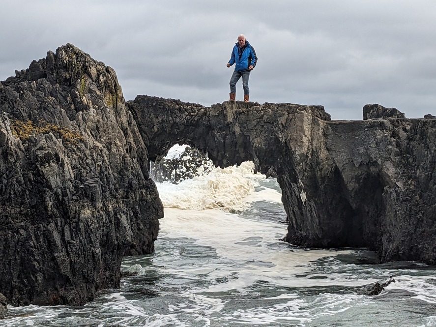 Narrow rock bridge across a flooded inlet.