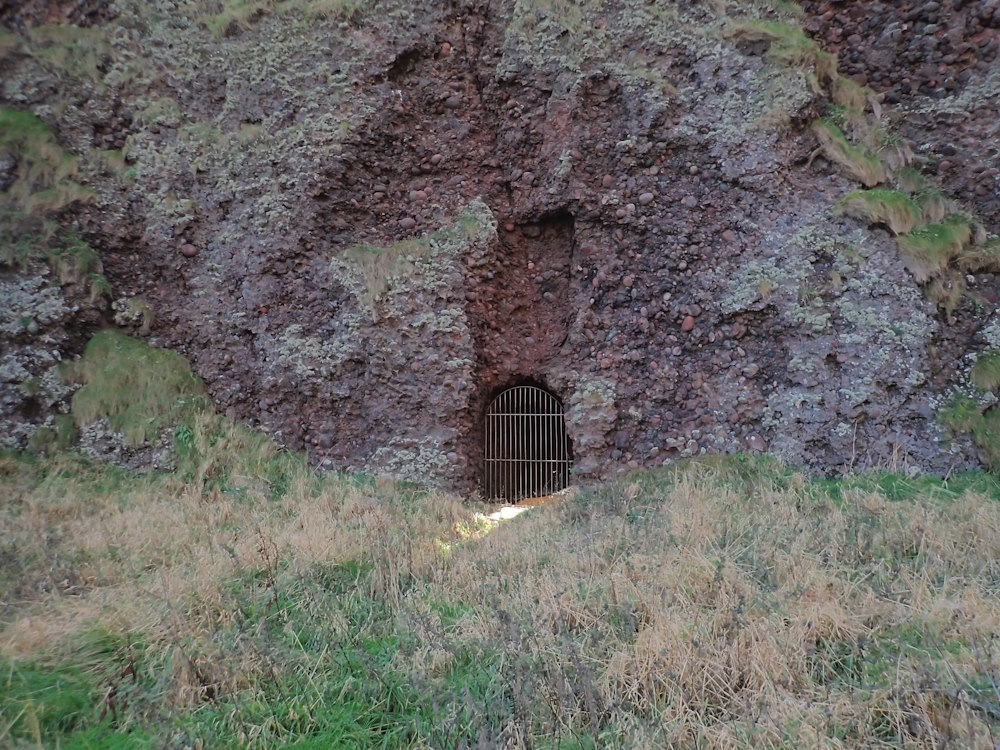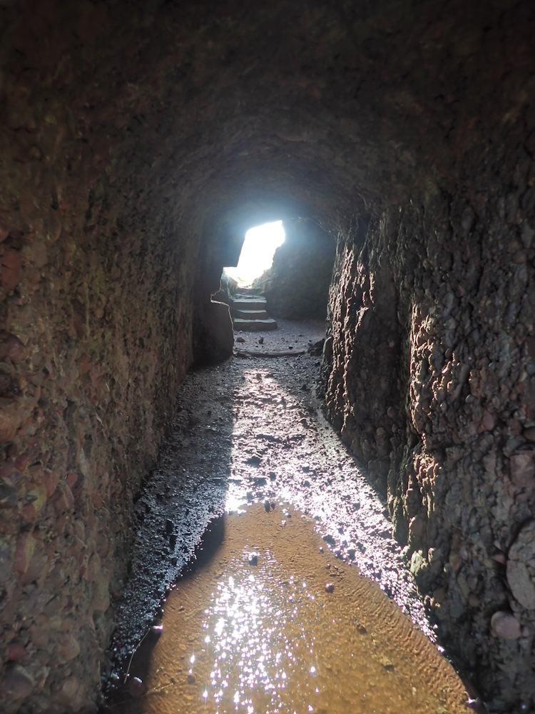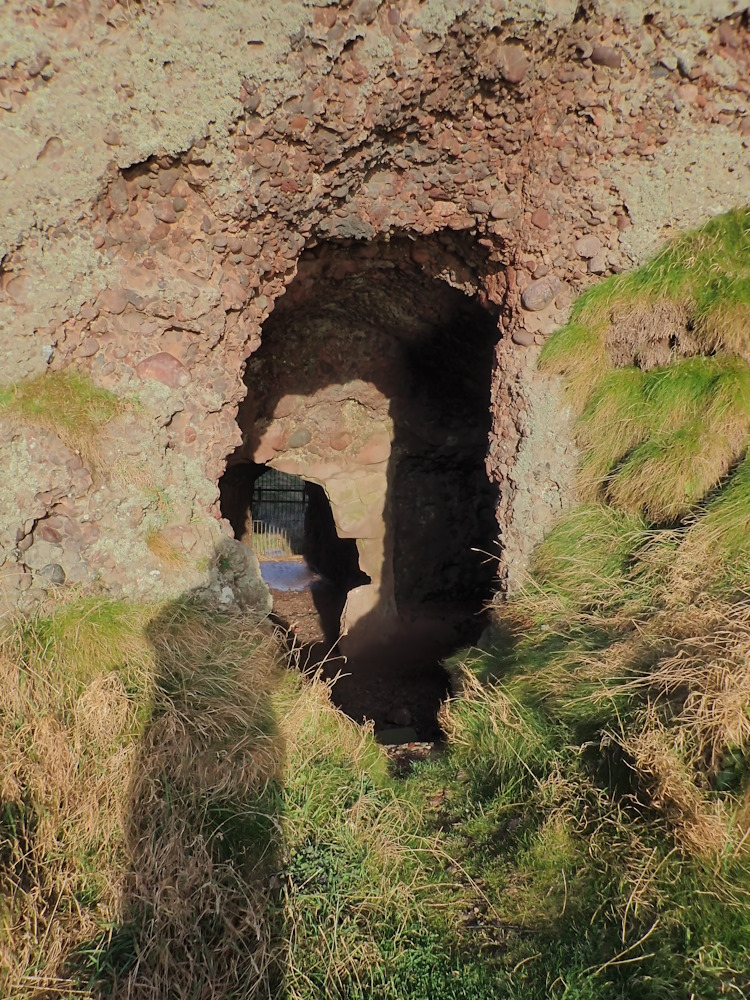 A short man-made tunnel allowing access between Castle Haven and Old Hall Bay. Now blocked at the N end by a metal fence-like gate which gives a good view in and through. It has a wider section just inside the S entrance.