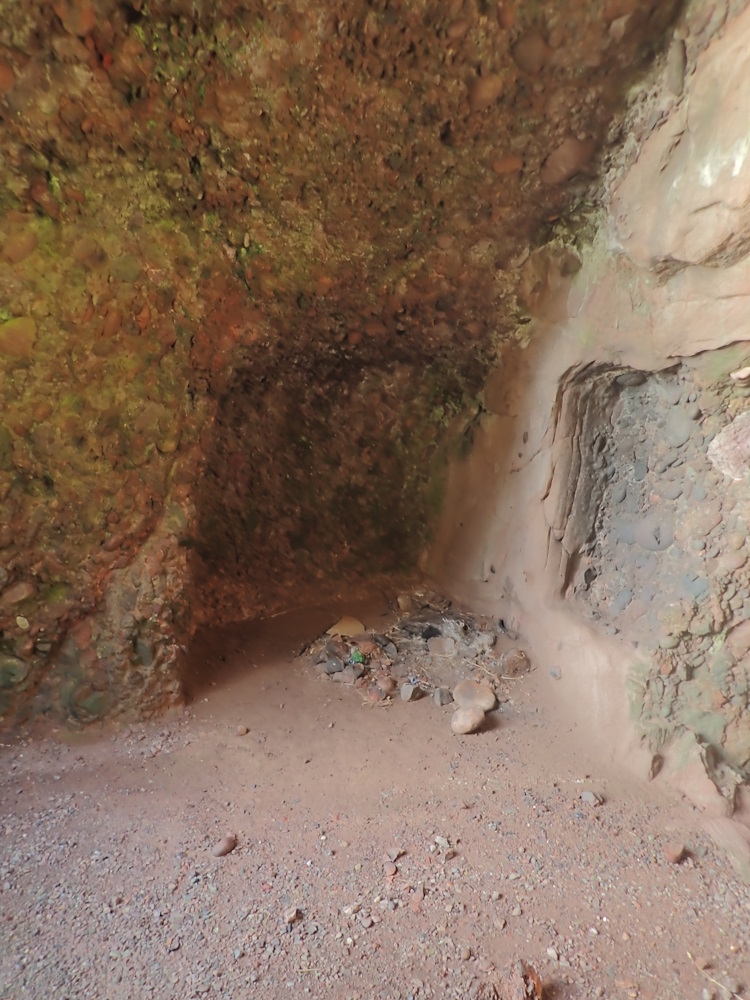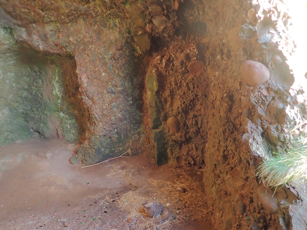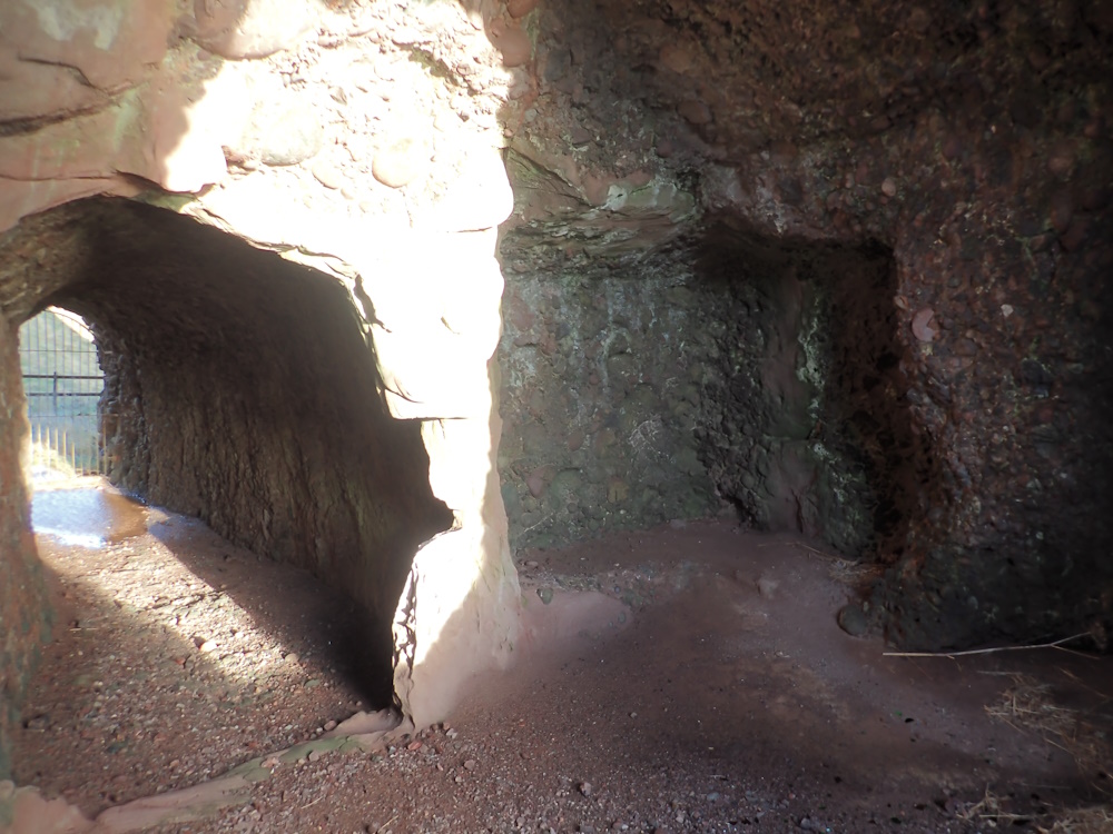 Access: from the path to the castle, through the fence warning against falling stones, over a scramble a little W of the tunnel to a narrow path on a steep slope, which goes E to just below the S entrance.