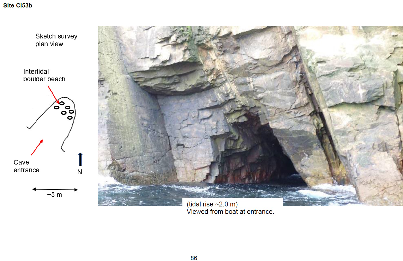 CI53b entrance estimated ~4 m wide at waterline with ceiling at ~6m ACD. Passage length estimated as ~5 m with a boulder beach visible at the back. [Report 1145]