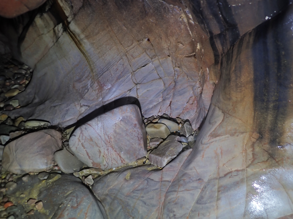 A small intertidal cave facing W by half N (277) on the W side of West Priest's Craig.