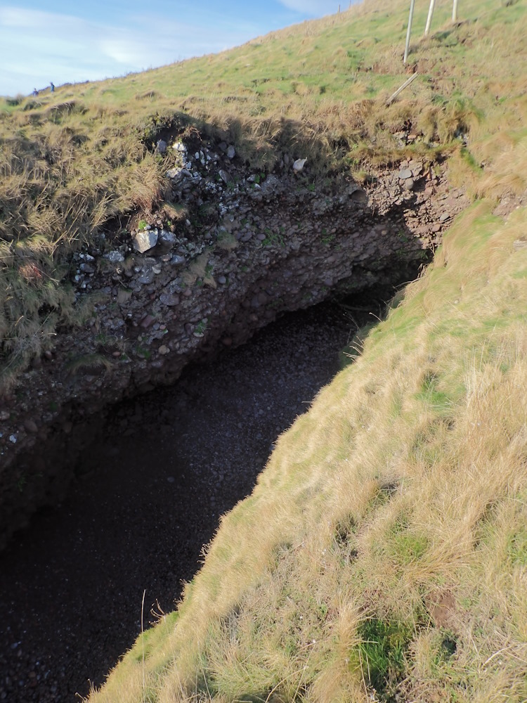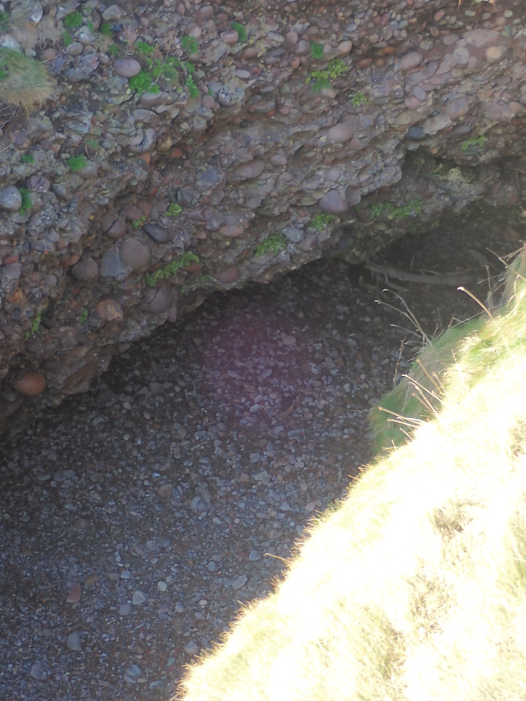 A sea cave at the end of a mini-geo facing SSE. It appears to curve slightly eastward.