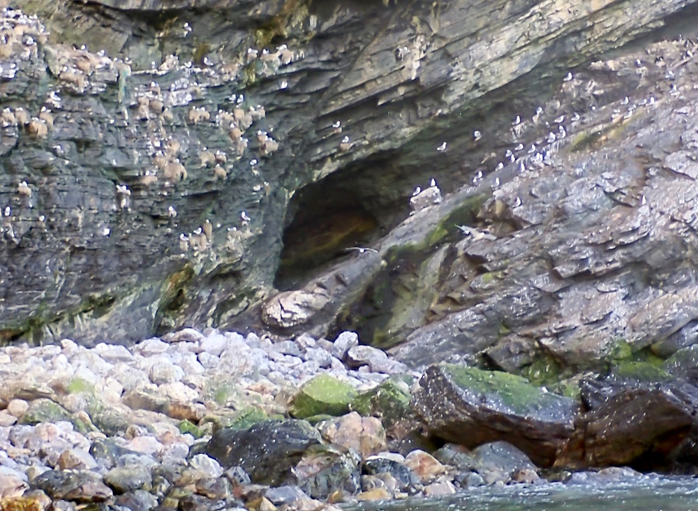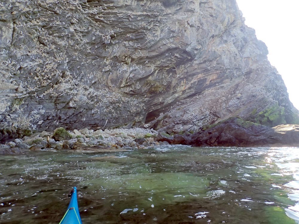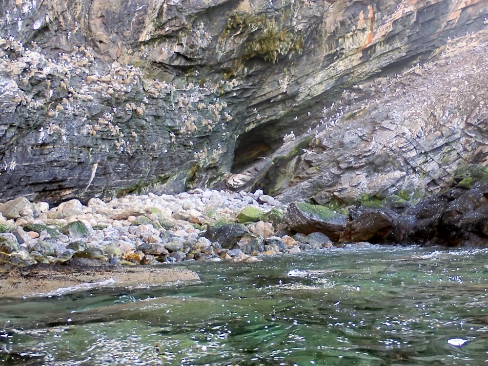 A supratidal cave/rockshelter facing N. Missing layer at ca 30 deg from horizontal, rising W. Entrance is a tilted lozenge shape and is about 4.6 m wide.