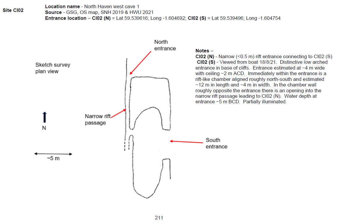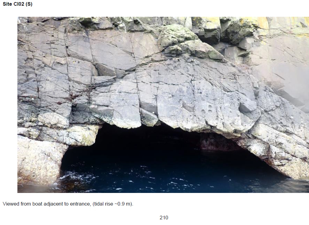 CI02 (S) - Viewed from boat 18/8/21. Distinctive low arched entrance in base of cliffs. Entrance estimated at ~4 m wide with ceiling ~2 m ACD. Immediately within the entrance is a rift-like chamber aligned roughly north-south and estimated ~12 m in length and ~4 m in width. In the chamber wall roughly opposite the entrance there is an opening into the narrow rift passage leading to CI02 (N). Water depth at entrance ~5 m BCD. Partially illuminated. [Report 1145 p211]