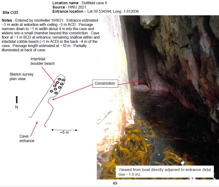 'Entered by snorkeller 19/8/21. Entrance estimated ~3 m wide at waterline with ceiling ~5 m ACD. Passage narrows down to ~1 m width about 4 m into the cave and widens into a small chamber beyond this constriction. Cave floor at ~1 m BCD at entrance, remaining shallow within and intertidal cobble beach (>1 m ACD) in the back ~4 m of the cave. Passage length estimated at ~10 m. Partially illuminated at back of cave. ' [Report 1145]