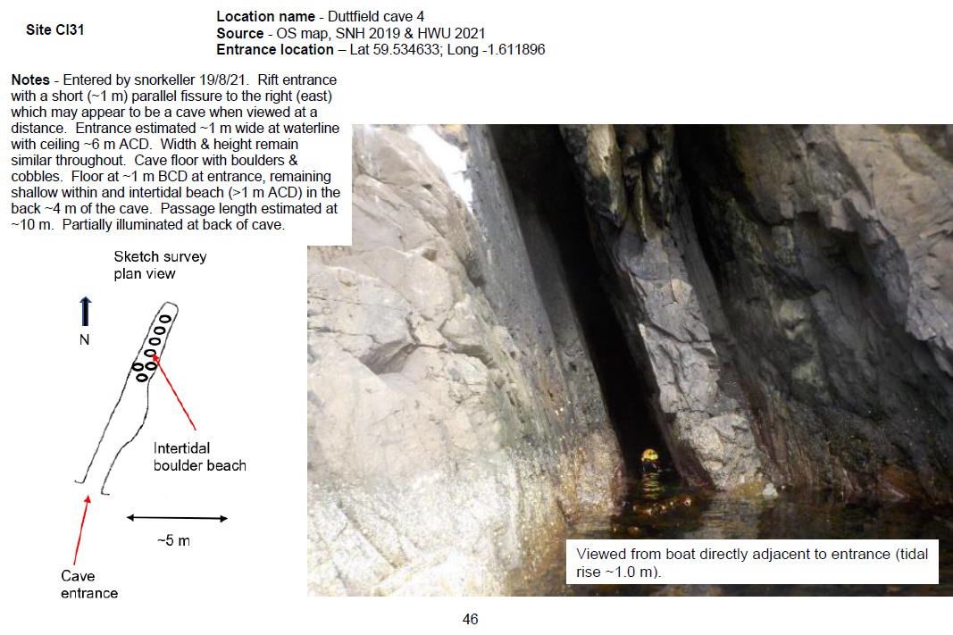 'Entered by snorkeller 19/8/21. Rift entrance with a short (~1 m) parallel fissure to the right (east) which may appear to be a cave when viewed at a distance. Entrance estimated ~1 m wide at waterline with ceiling ~6 m ACD. Width & height remain similar throughout. Cave floor with boulders & cobbles. Floor at ~1 m BCD at entrance, remaining shallow within and intertidal beach (>1 m ACD) in the back ~4 m of the cave. Passage length estimated at ~10 m. Partially illuminated at back of cave. ' [Report 1145]