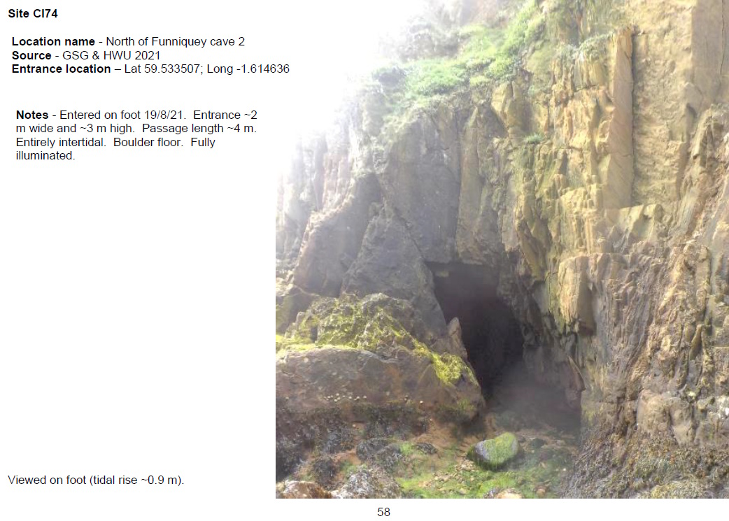 'Entered on foot 19/8/21. Entrance ~2 m wide and ~3 m high. Passage length ~4 m. Entirely intertidal. Boulder floor. Fully illuminated.' [Report 1145]