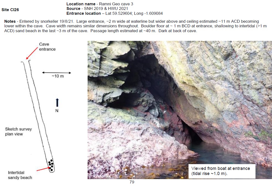 'Entered by snorkeller 19/8/21. Large entrance, ~2 m wide at waterline but wider above and ceiling estimated ~11 m ACD becoming lower within the cave. Cave width remains similar dimensions throughout. Boulder floor at ~ 1 m BCD at entrance, shallowing to intertidal (>1 m ACD) sand beach in the last ~3 m of the cave. Passage length estimated at ~40 m. Dark at back of cave. Noted floor of scoured boulders and hydroid / bryozoan turf on walls for first ~10 m.' [Report 1145]