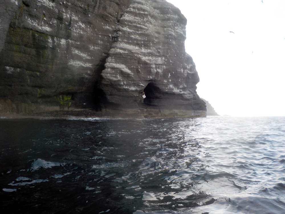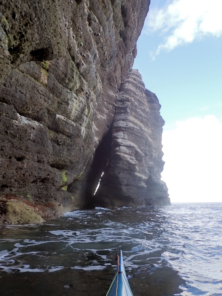 A rift cave which is intertidal from its WNW facing entrance. The rift narrows towards the SE entrance. There is a wide NE entrance which is supratidal. The WNW entrance widens inside then stops about 15m inside at some wave cut platform horizontal layers.
