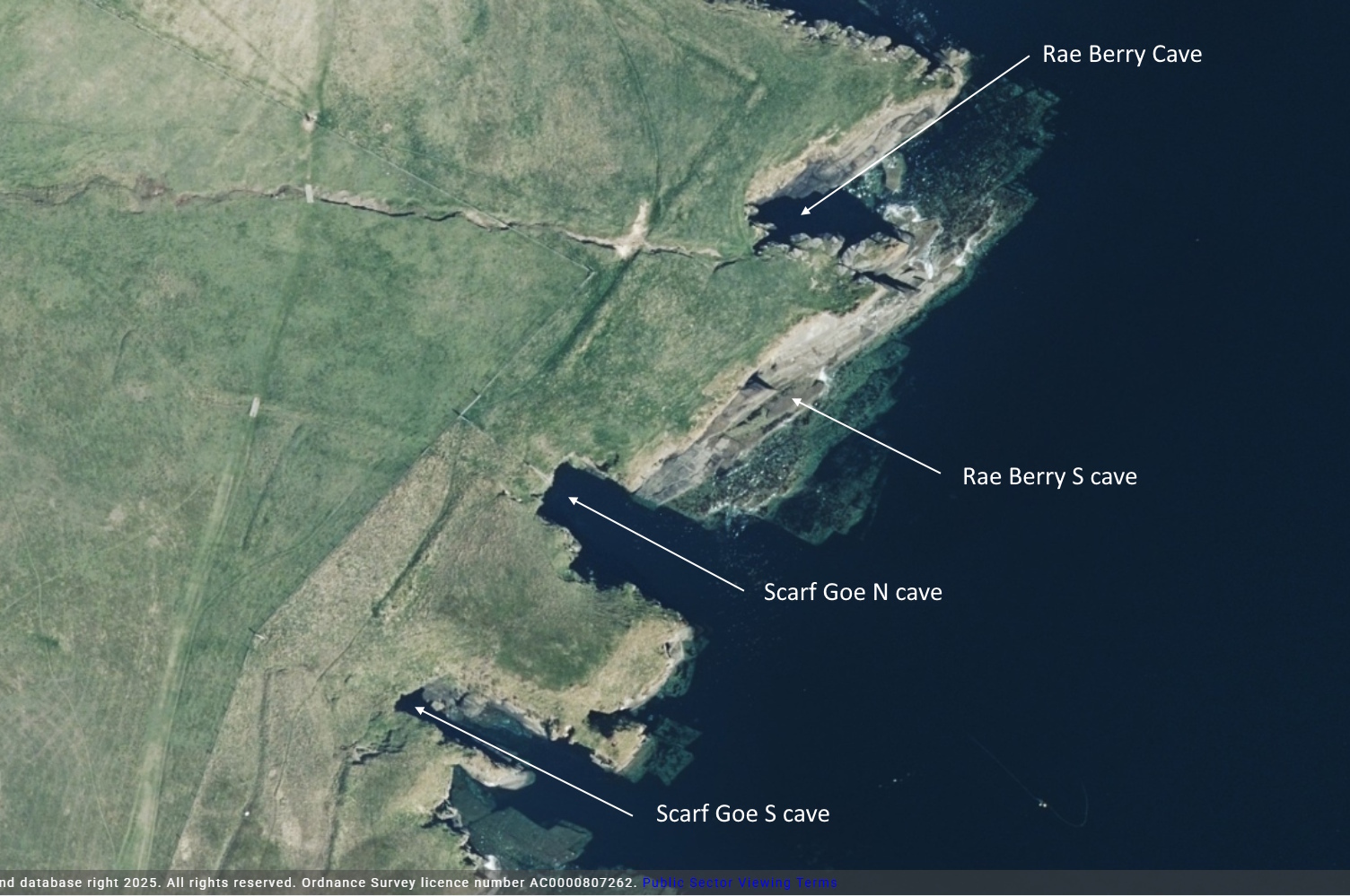 Scarf Goe north cave Rae Berry south cave Rae Berry Cave Black Goe cave (N entrance) Boiling Kettle Cave Black Goe cave (S entrance) Little Clett Cave North cave (The Loops) Holborn Head [Overview] Green Skerry cave Rumbling Goes entrance Swiney Cave Back Green Skerry north cave Back Green Skerry south cave The Brigs Burn Mouth south east cave Burn Mouth south south west cave Burn Mouth north cave Fish Scale Geo Cave Long Rigging Cave (N entrance) Long Rigging Cave (S entrance) Pillar of Clett