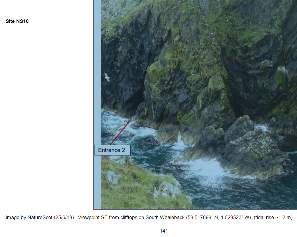 Two potential entrances photographed from clifftops. Entrance 1 appears shallow and wave surged. Entrance 2 appears to be intertidal. Neither are considered as offering good potential of a significant cave. [Report 1145]