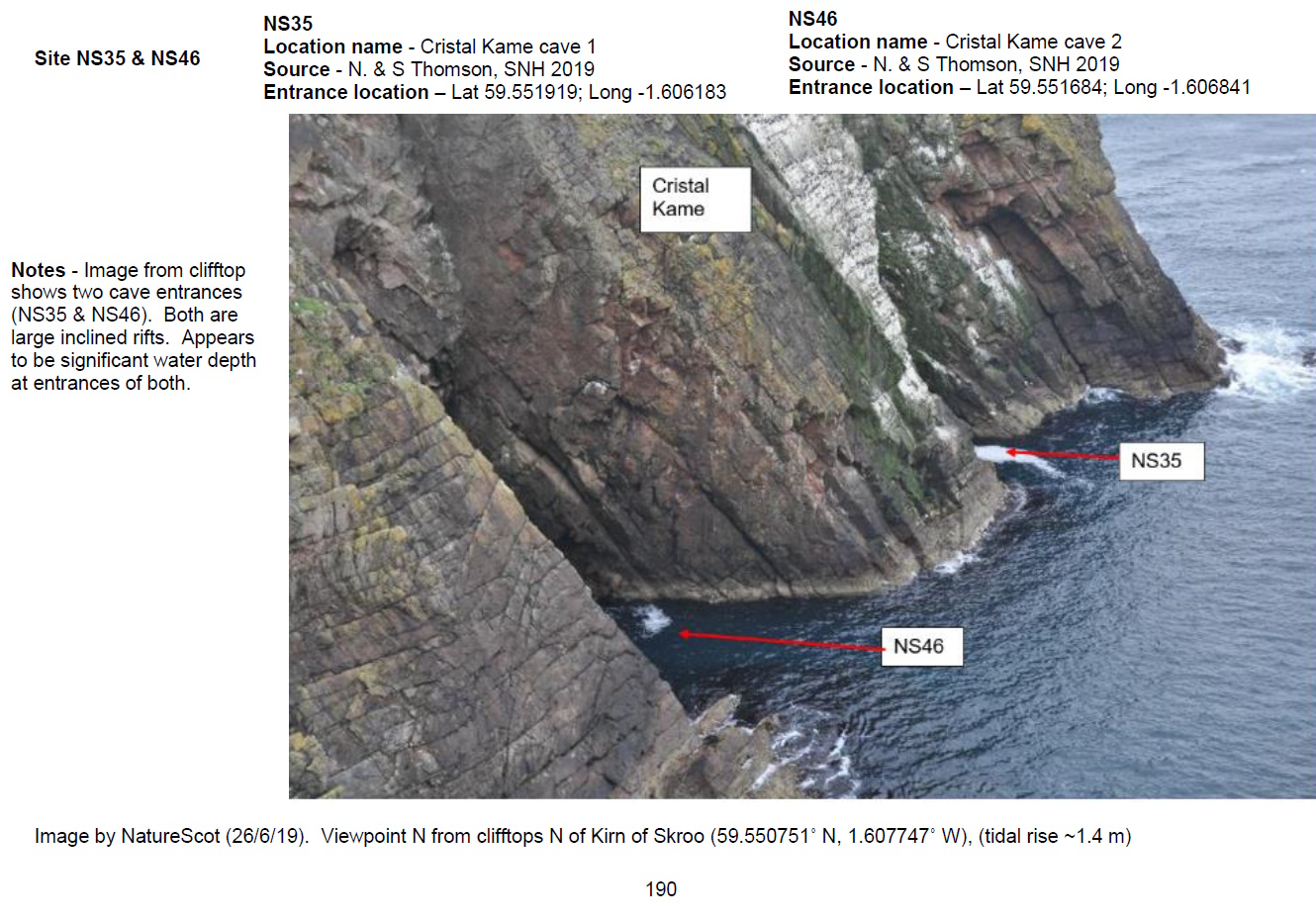 Image from clifftop shows two cave entrances (NS35 & NS46). Both are large inclined rifts. Appears to be significant water depth at entrances of both. Potential sites of interest. [Report 1145]